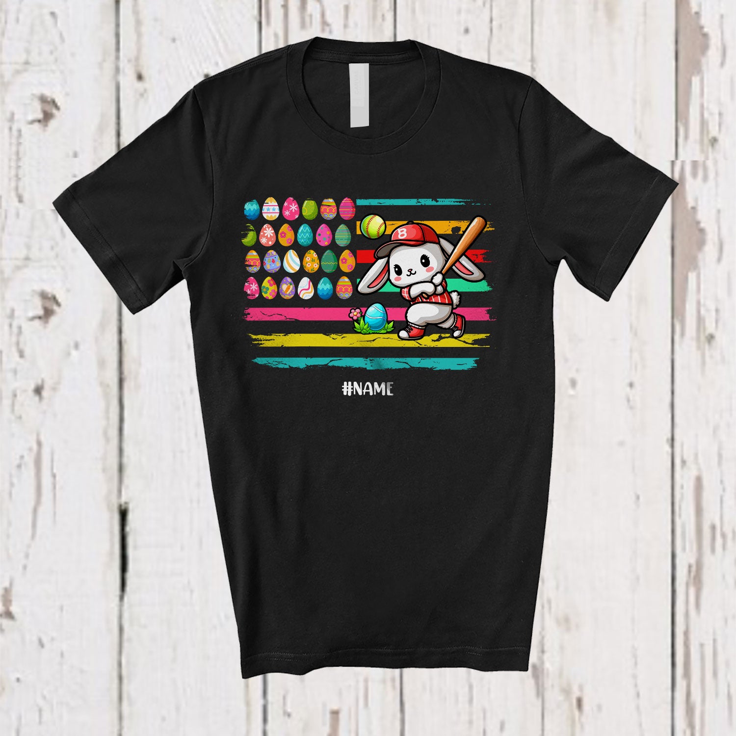 Personalized American Flag Bunny Playing Softball; Lovely Easter Eggs Custom Name Sport Player T-Shirt