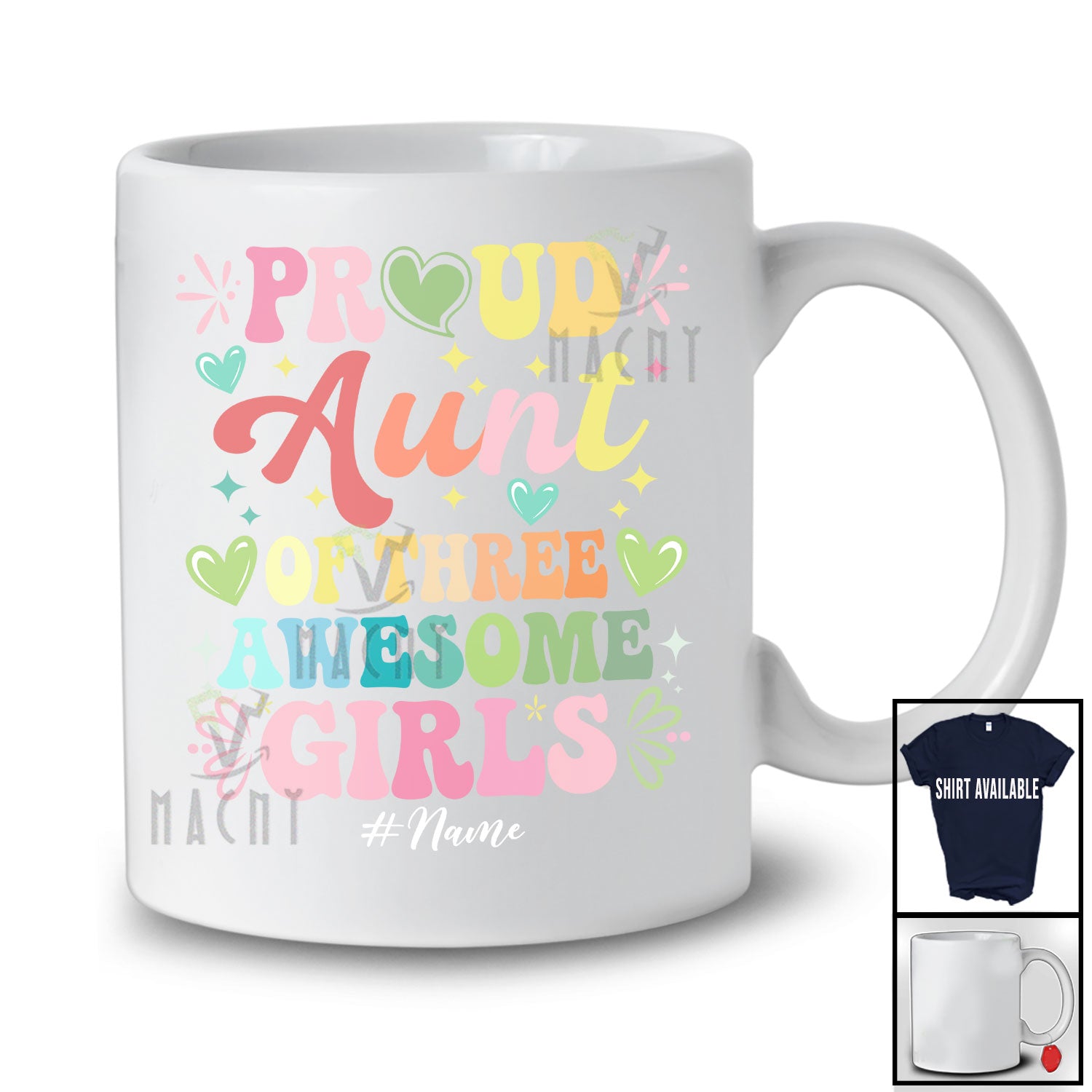 The Personalized Aunt of 3 Awesome Girls; Joyful Mother's Day Hearts; Custom Name Family T-Shirt destined to impress, and priced at only $12.95, for a limited time.