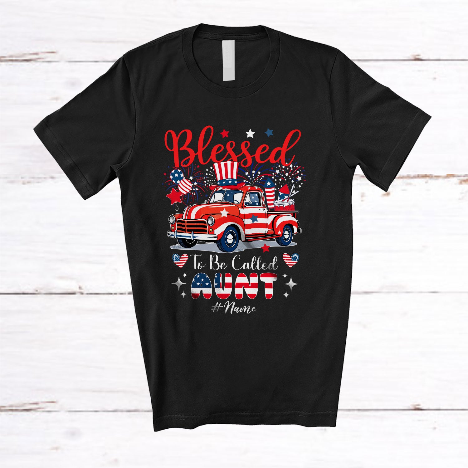 Personalized Blessed To Be Called Aunt; Lovely 4th of July US Flag Pickup Truck; Custom Name Family T-Shirt. This cotton t-shirt is a durable staple product with a classic fit. One of the most popular items, it has a relaxed style made for everyday and casual wear.