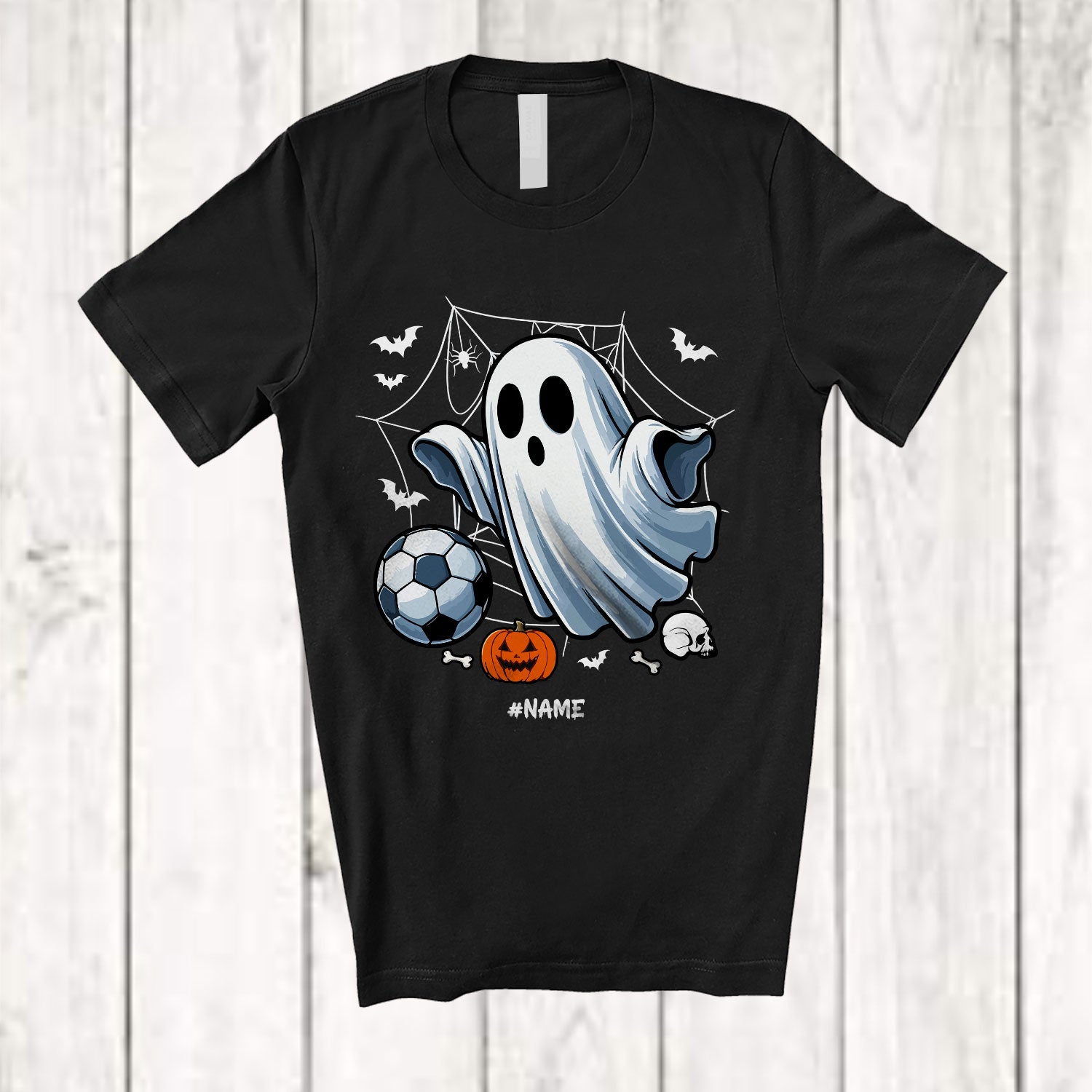 Personalized Boo Ghost Playing Soccer; Scary Halloween Custom Name Soccer Player Team T-Shirt. This cotton t-shirt is a durable staple product with a classic fit. One of the most popular items, it has a relaxed style made for everyday and casual wear.