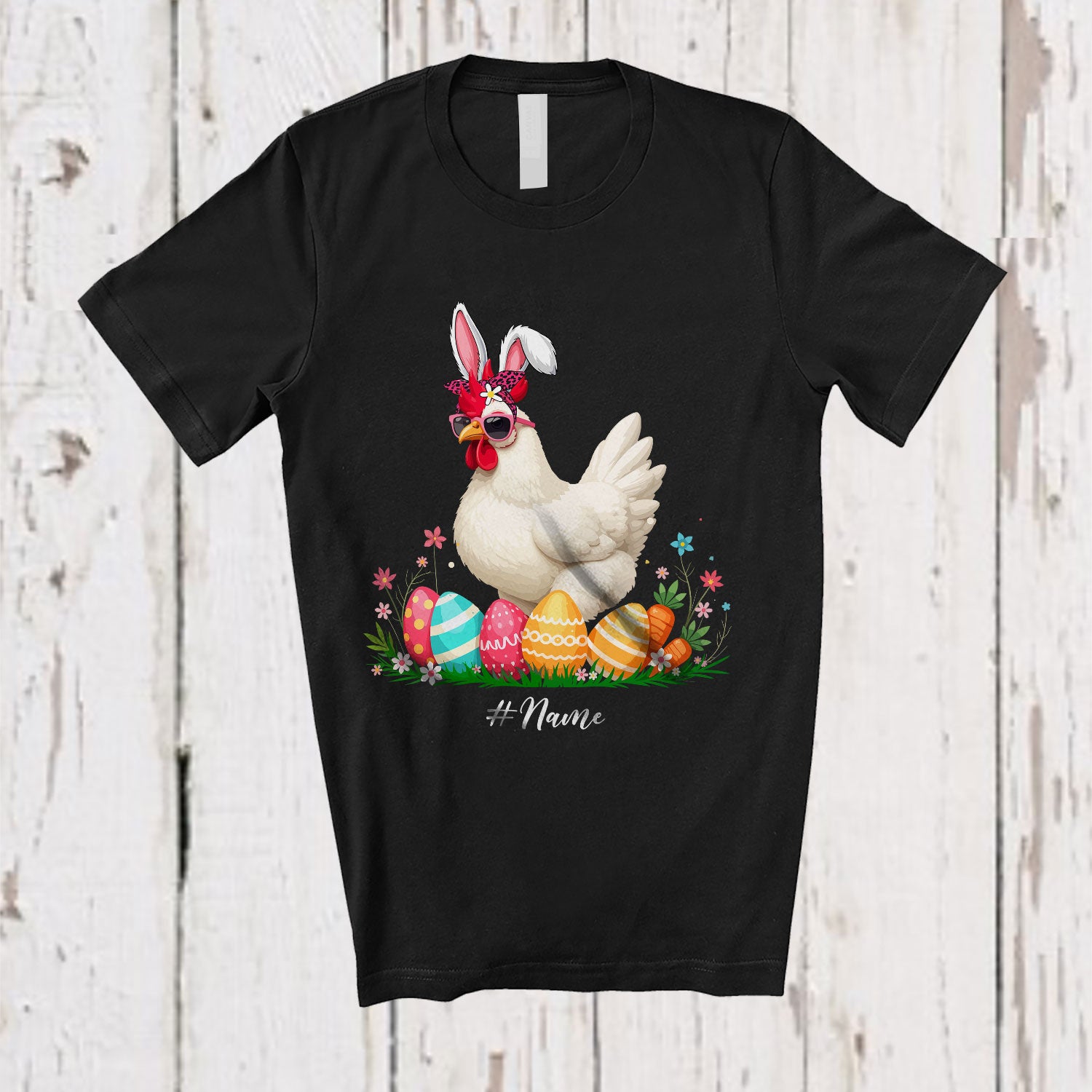 • Personalized Chicken Sunglasses Eating Carrot; Lovely Easter Custom Name Farmer; Farm Eggs Hunt T-Shirt. This cotton t-shirt is a durable staple product with a classic fit. One of the most popular items, it has a relaxed style made for everyday and casual wear.