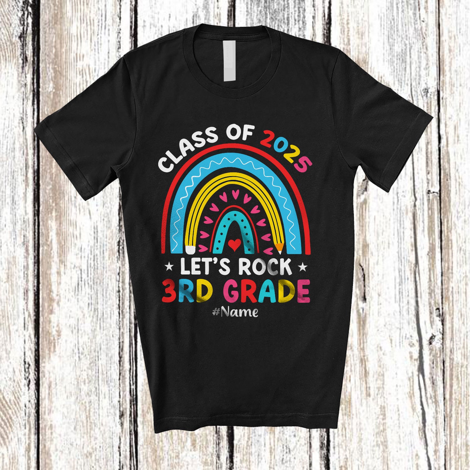 • Personalized Class Of 2025 Rock 3rd Grade; Joyful Back To School Rainbow; Custom Name Students T-Shirt. This cotton t-shirt is a durable staple product with a classic fit. One of the most popular items, it has a relaxed style made for everyday and casual wear.
