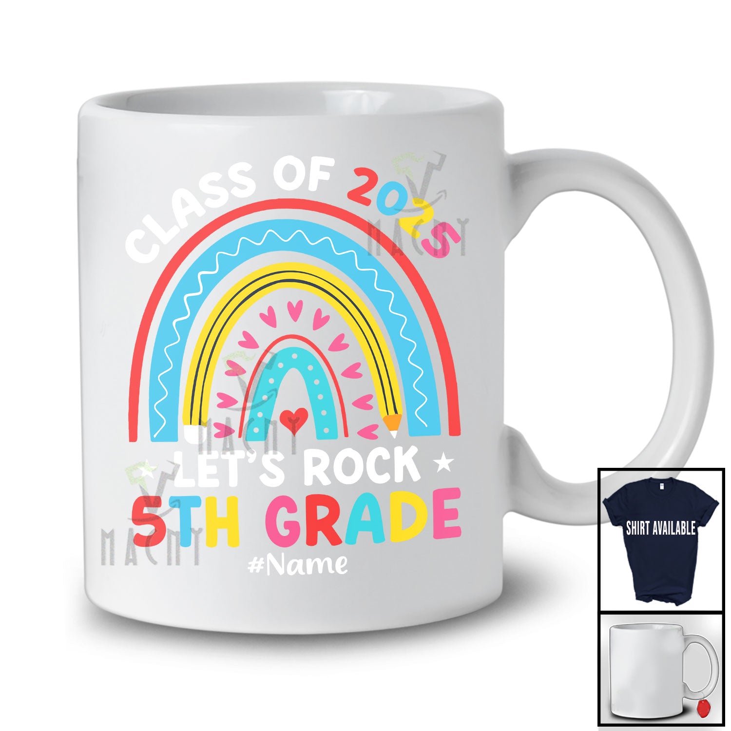 • Personalized Class Of 2025 Rock 5th Grade; Joyful Back To School Rainbow; Custom Name Students T-Shirt. This cotton t-shirt is a durable staple product with a classic fit. One of the most popular items, it has a relaxed style made for everyday and casual wear.