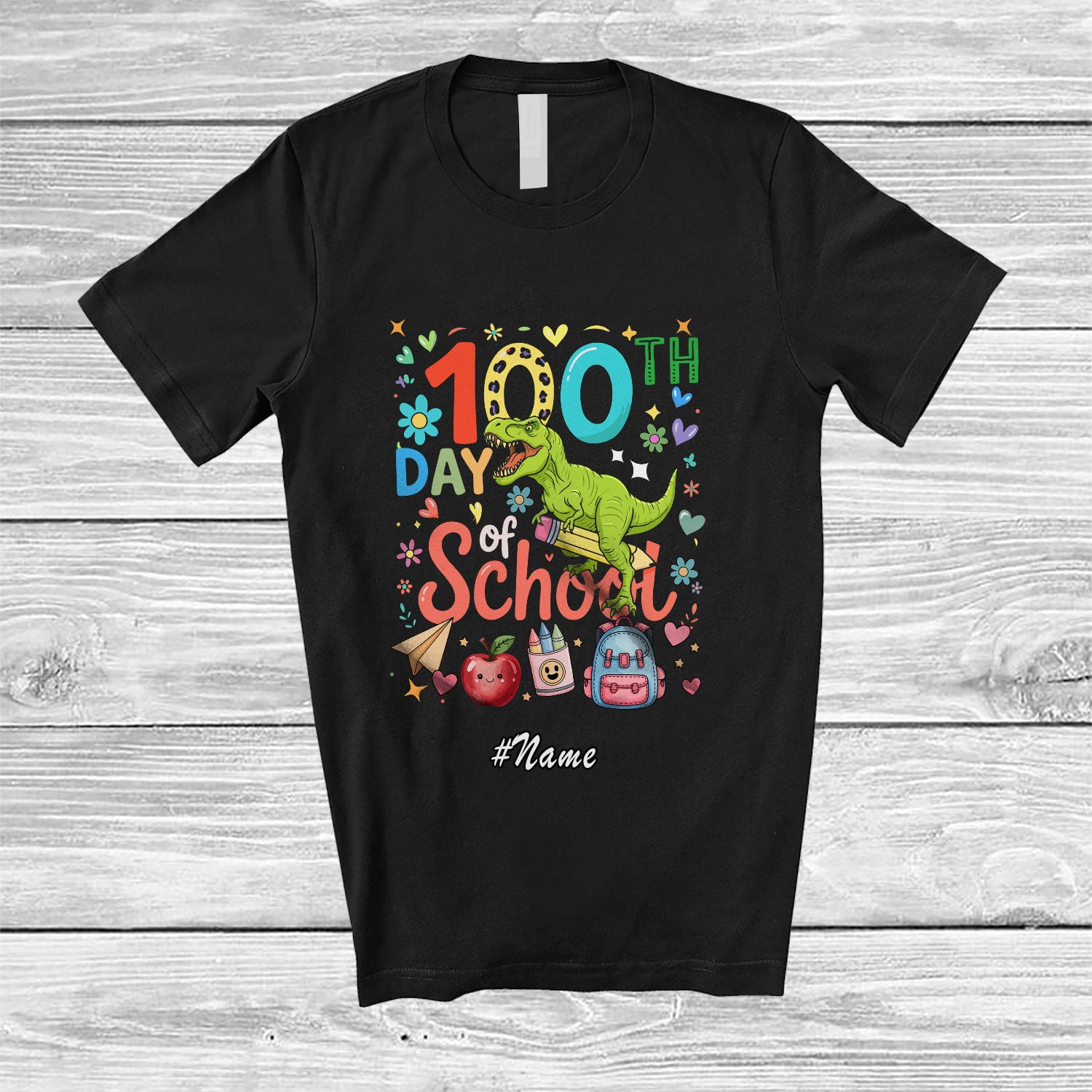 • Personalized Custom Name 100th Day Of School; Adorable T-Rex With Pencil; Teacher Students T-Shirt. This cotton t-shirt is a durable staple product with a classic fit. One of the most popular items, it has a relaxed style made for everyday and casual wear.