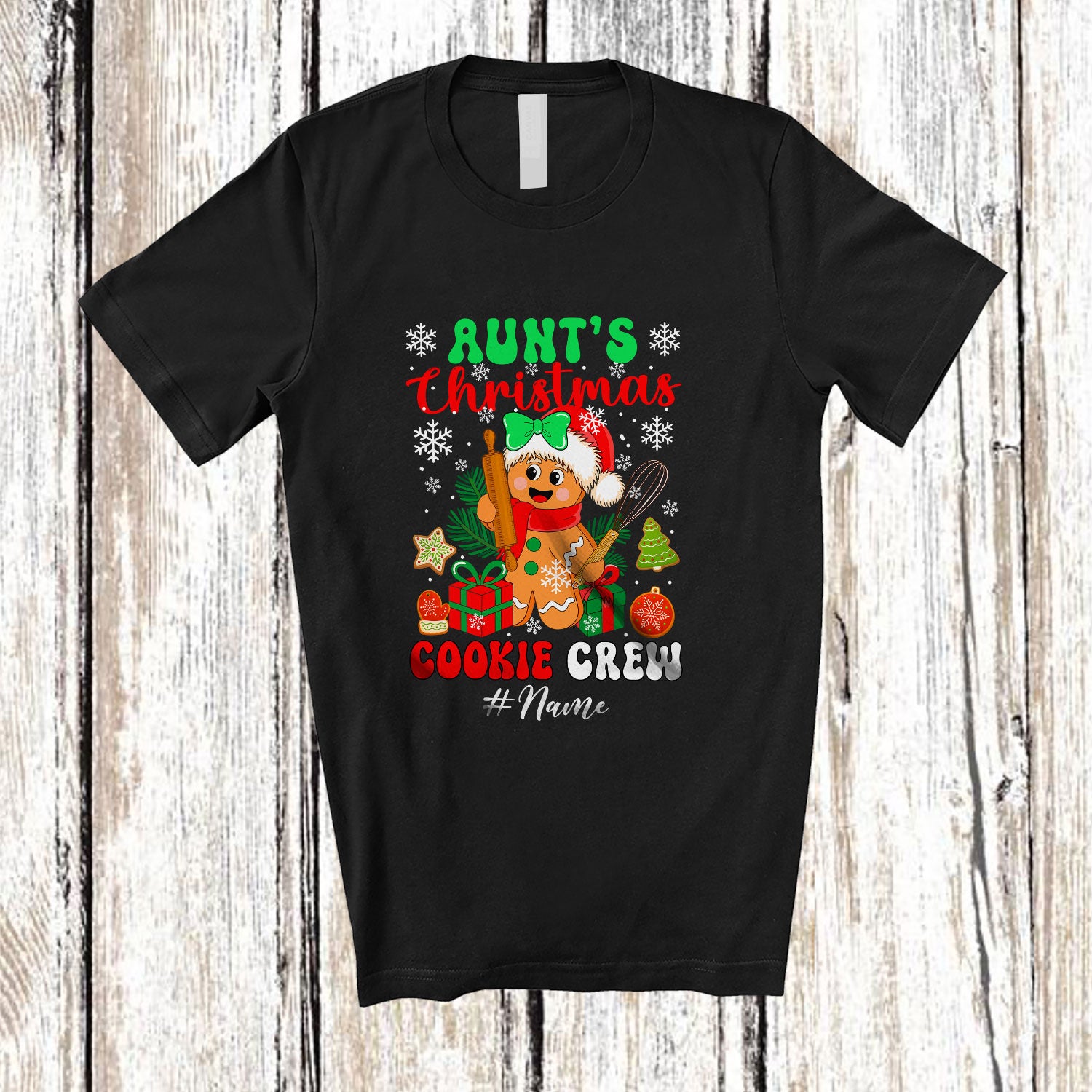 • Personalized Custom Name Aunt's Christmas Cookie Crew; Humorous Baking Baker Family T-Shirt. This cotton t-shirt is a durable staple product with a classic fit. One of the most popular items, it has a relaxed style made for everyday and casual wear.