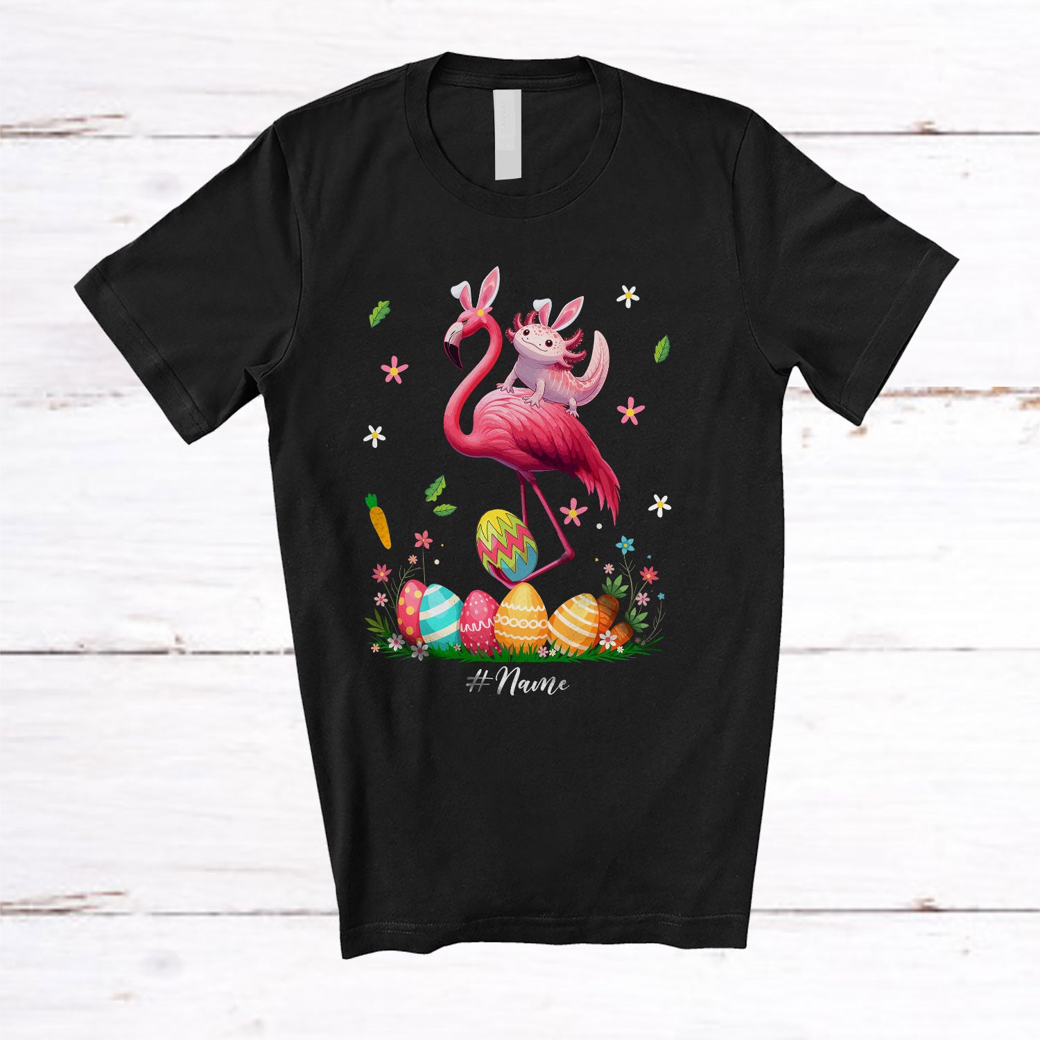 Personalized Custom Name Axolotl Ridding Flamingo; Amazing Easter Eggs Hunting; Family T-Shirt. This cotton t-shirt is a durable staple product with a classic fit. One of the most popular items, it has a relaxed style made for everyday and casual wear.