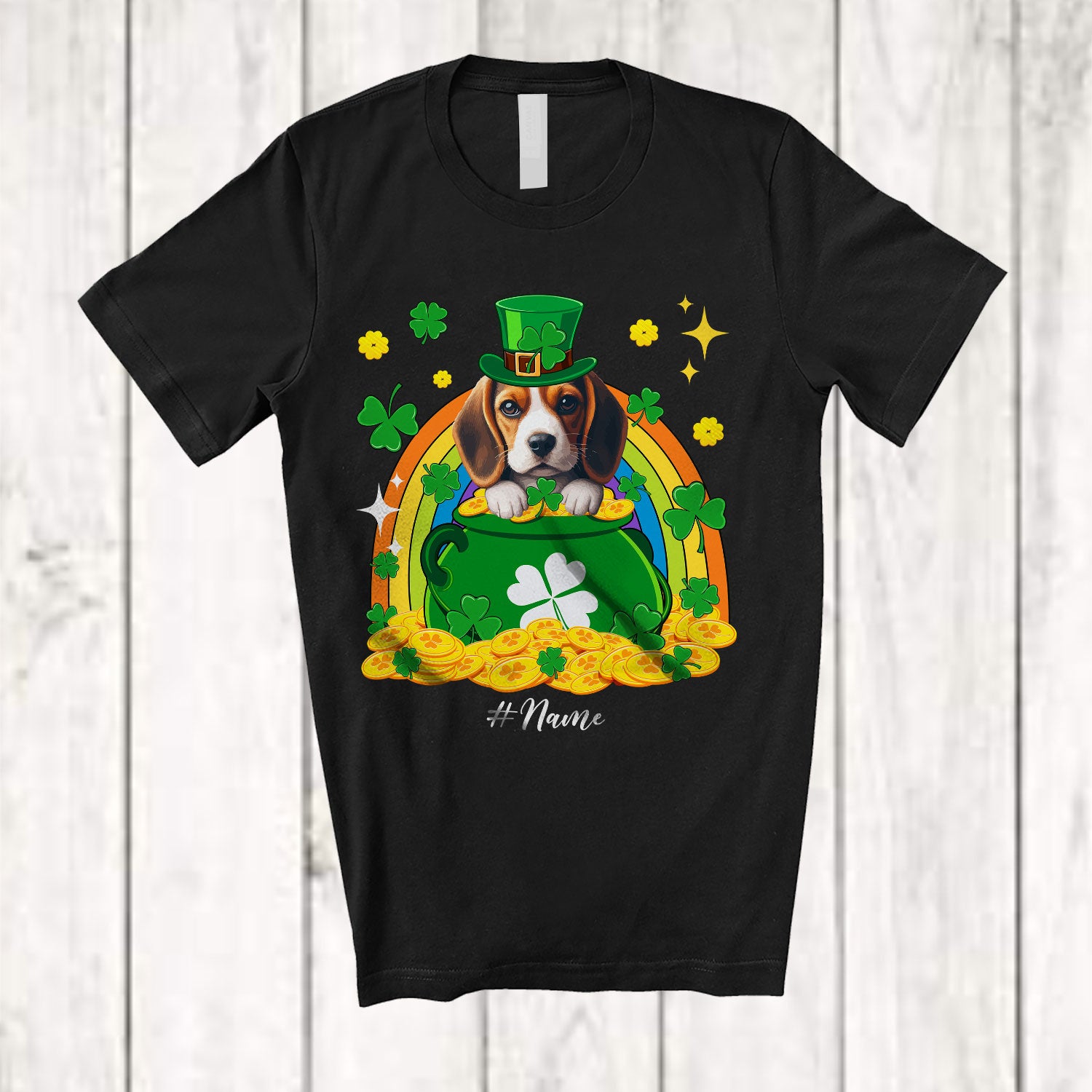 • Personalized Custom Name Beagle Leprechaun In Pot Of Gold; Lovely St. Patrick's Day Rainbow T-Shirt. This cotton t-shirt is a durable staple product with a classic fit. One of the most popular items, it has a relaxed style made for everyday and casual wear.