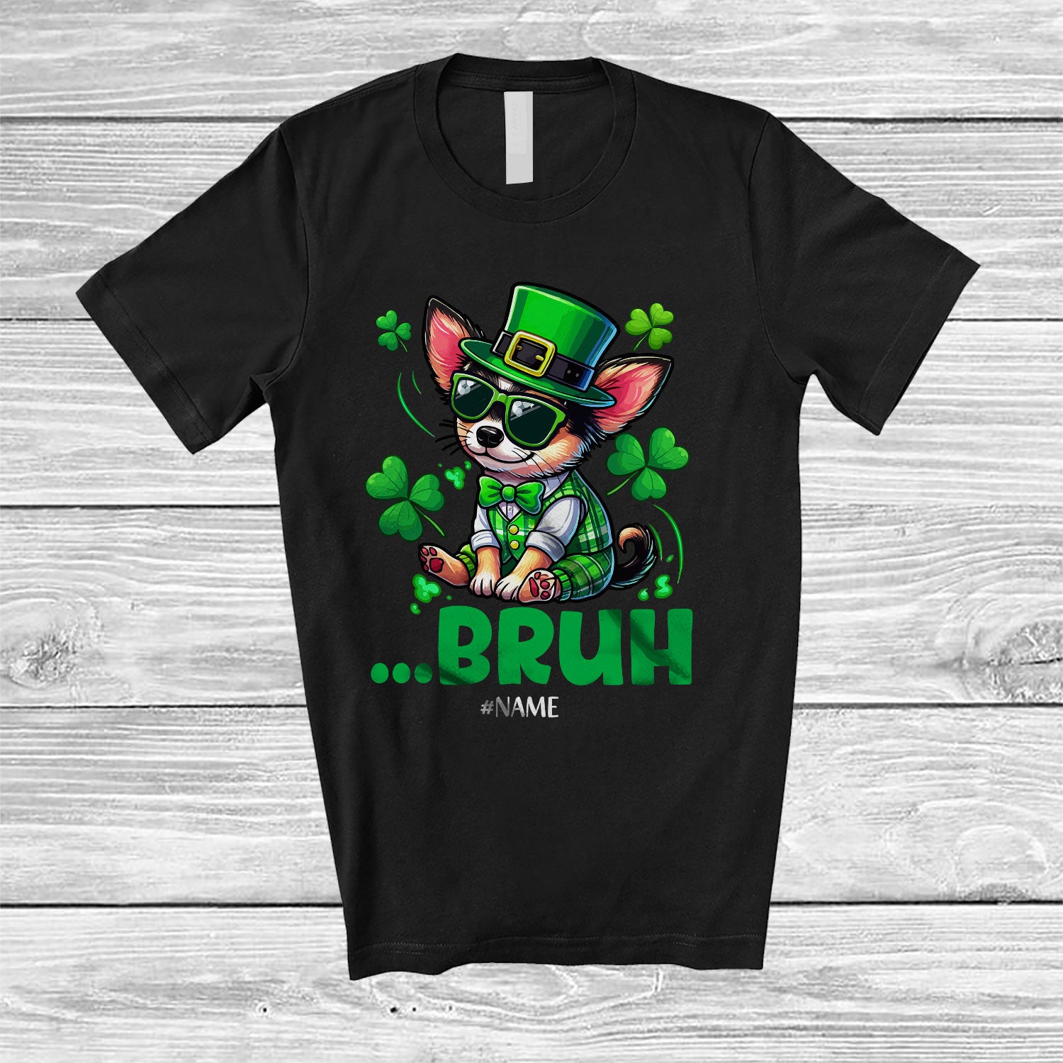 Personalized Custom Name Bruh; Joyful St. Patrick's Day Chihuahua Leprechaun Shamrocks T-Shirt. This cotton t-shirt is a durable staple product with a classic fit. One of the most popular items, it has a relaxed style made for everyday and casual wear.
