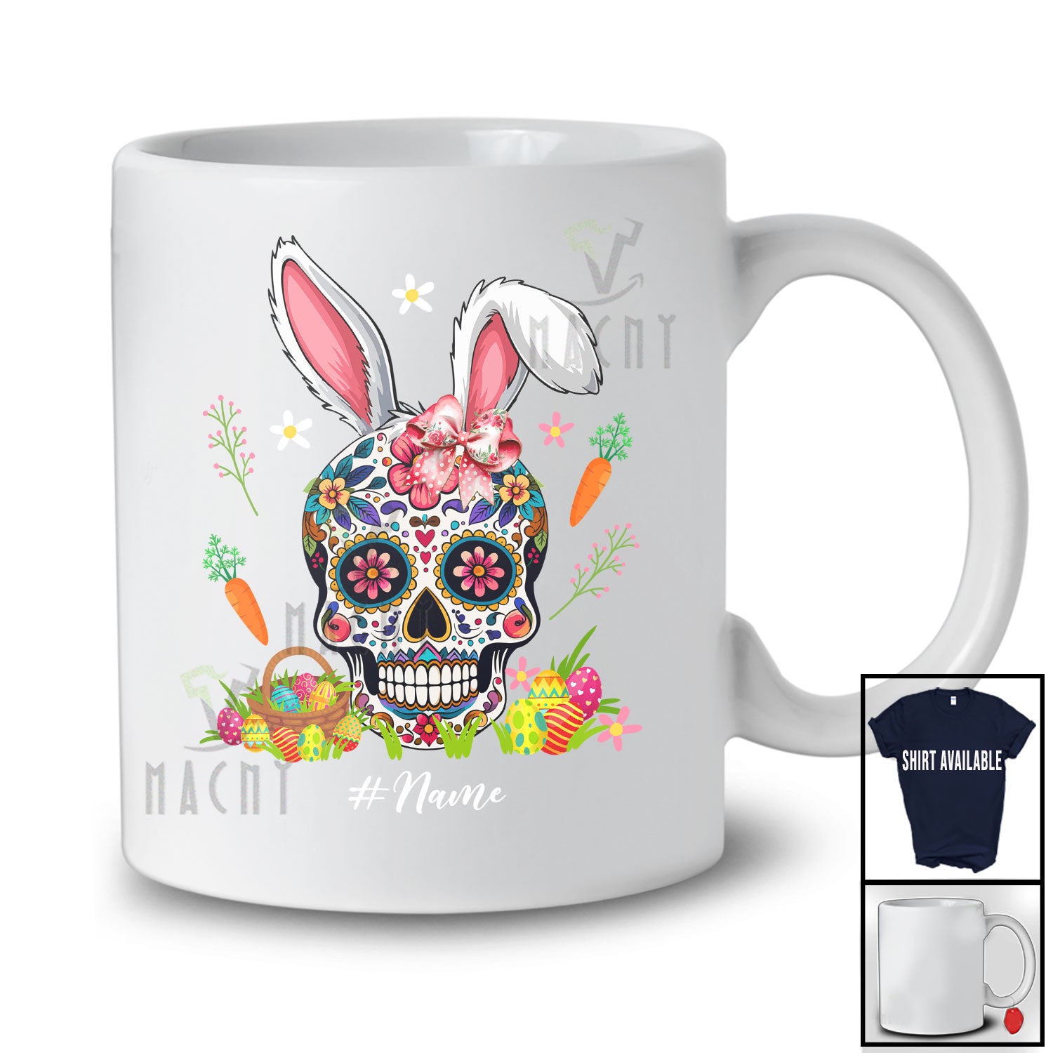 Personalized Custom Name Bunny Sugar Skull With Egg Basket; Cheerful Easter Eggs Hunt; Family T-Shirt. This cotton t-shirt is a durable staple product with a classic fit. One of the most popular items, it has a relaxed style made for everyday and casual wear.