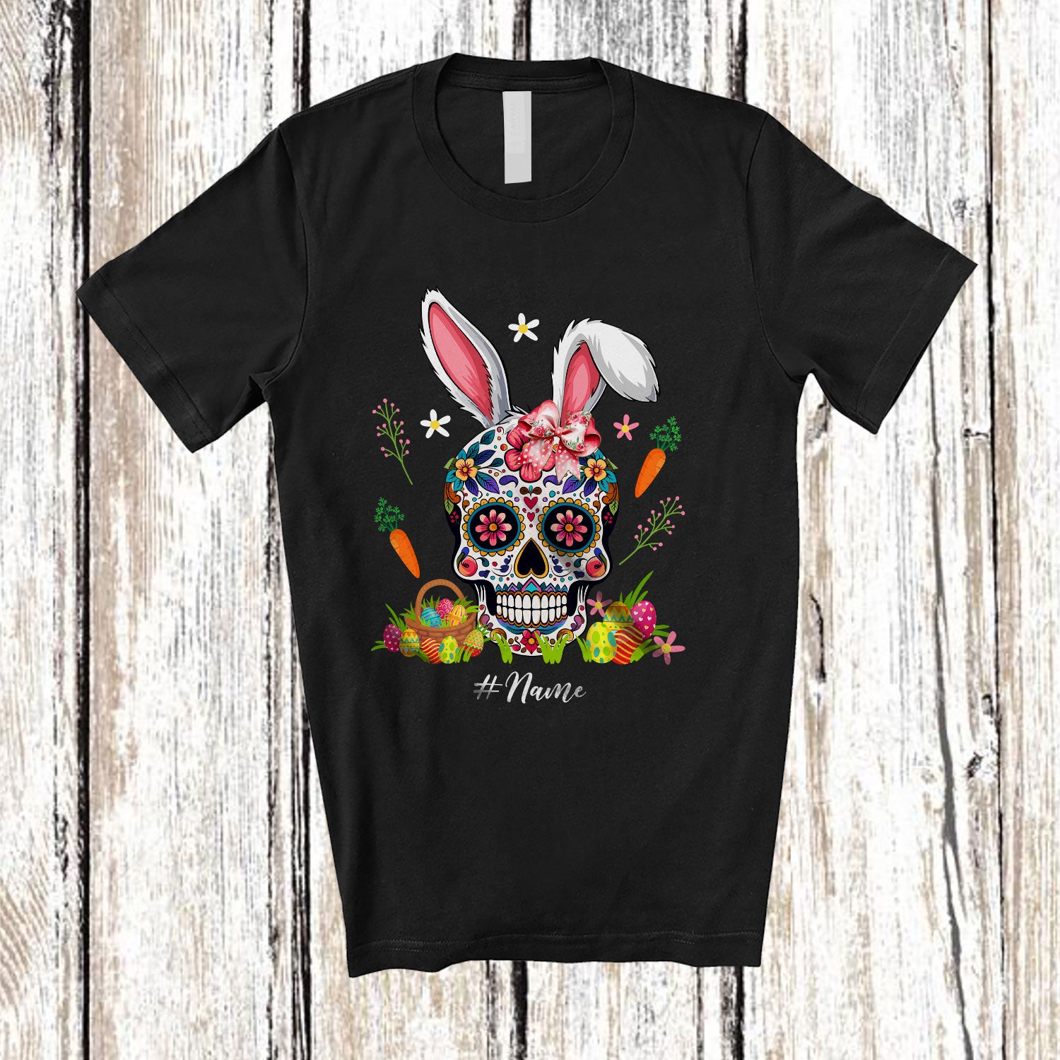 Personalized Custom Name Bunny Sugar Skull With Egg Basket; Cheerful Easter Eggs Hunt; Family T-Shirt