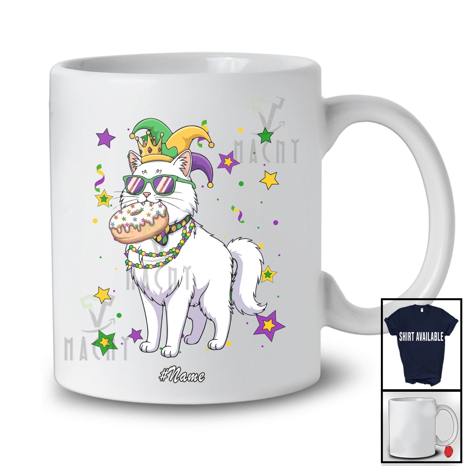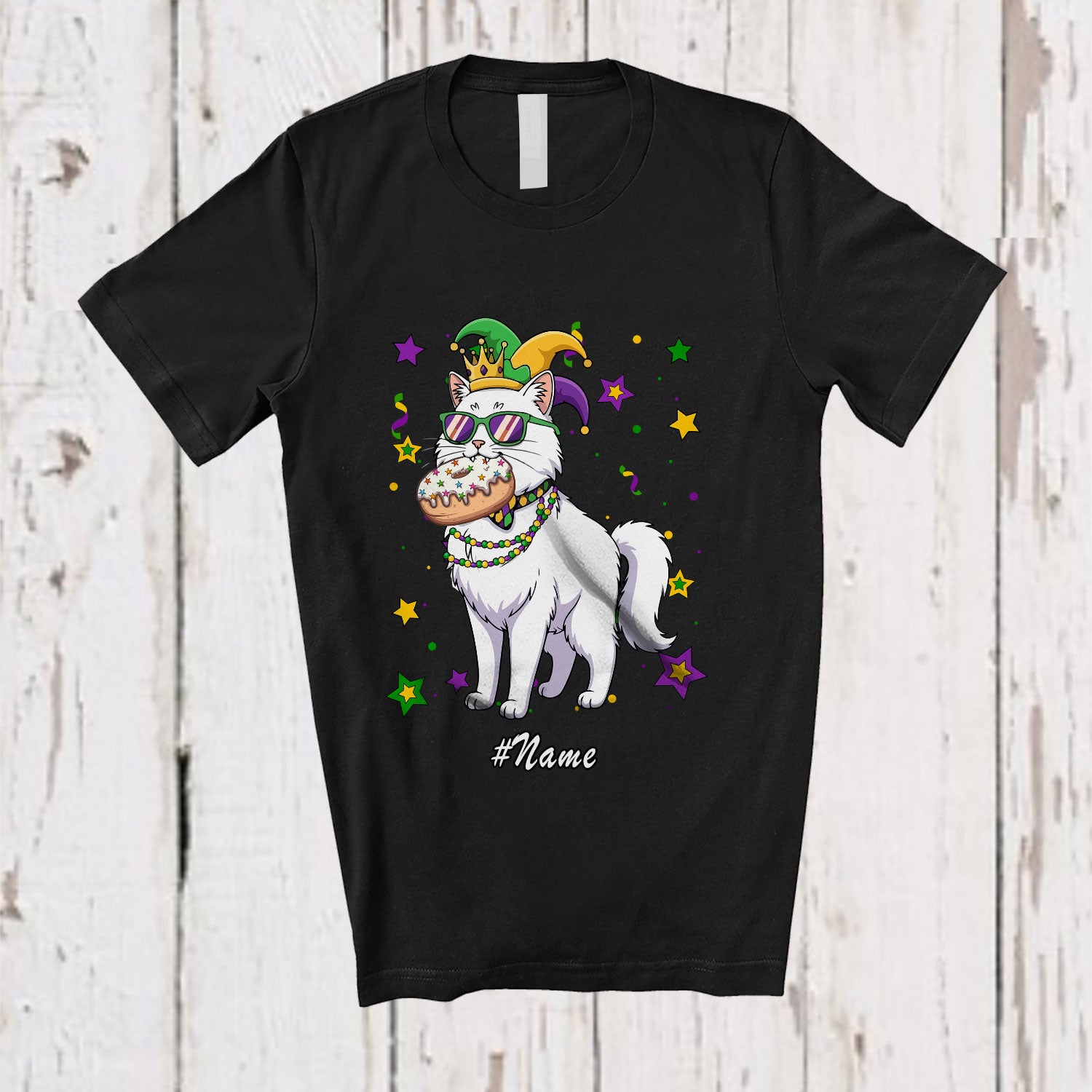 Personalized Custom Name Cat Sunglasses Eating Donut; Joyful Mardi Gras Beads Food T-Shirt. This cotton t-shirt is a durable staple product with a classic fit. One of the most popular items, it has a relaxed style made for everyday and casual wear.