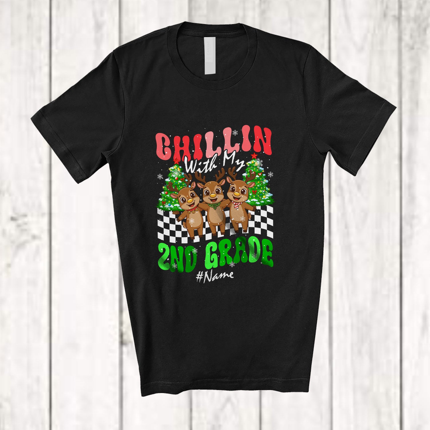 Personalized Custom Name Chillin With 2nd Grade; Amusing Christmas 3 Reindeers Students Teacher T-Shirt. This cotton t-shirt is a durable staple product with a classic fit. One of the most popular items, it has a relaxed style made for everyday and casual wear.