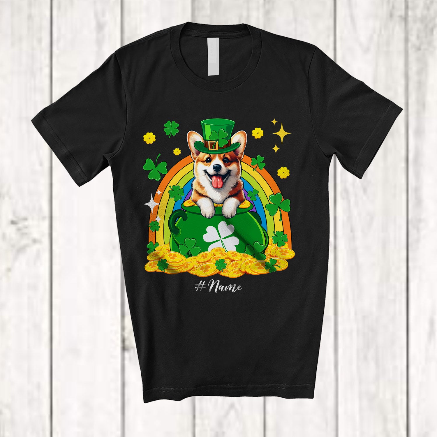 • Personalized Custom Name Corgi Leprechaun In Pot Of Gold; Lovely St. Patrick's Day Rainbow T-Shirt. This cotton t-shirt is a durable staple product with a classic fit. One of the most popular items, it has a relaxed style made for everyday and casual wear.