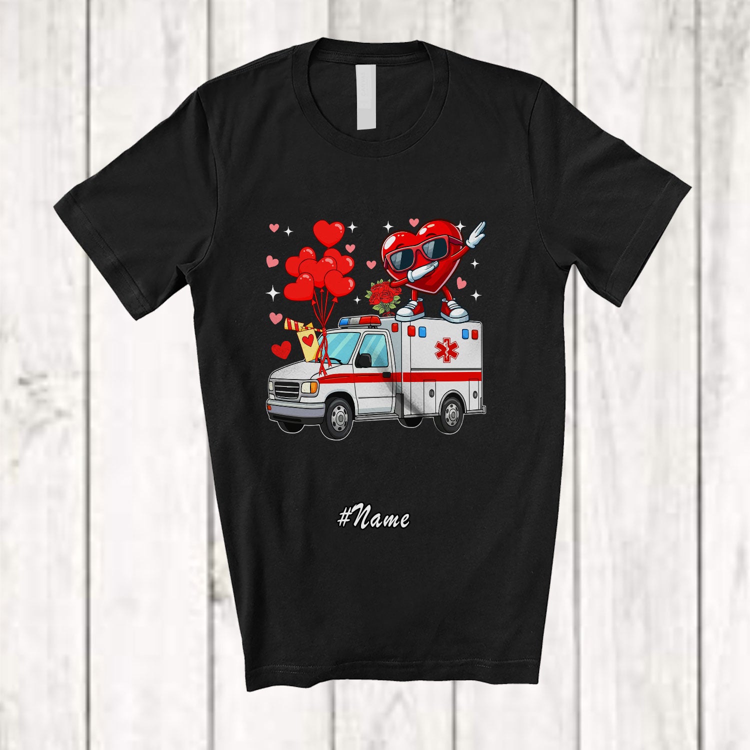 • Personalized Custom Name Dabbing Heart Driving Ambulance; Amusing Valentine Boys Men Driver T-Shirt. This cotton t-shirt is a durable staple product with a classic fit. One of the most popular items, it has a relaxed style made for everyday and casual wear.