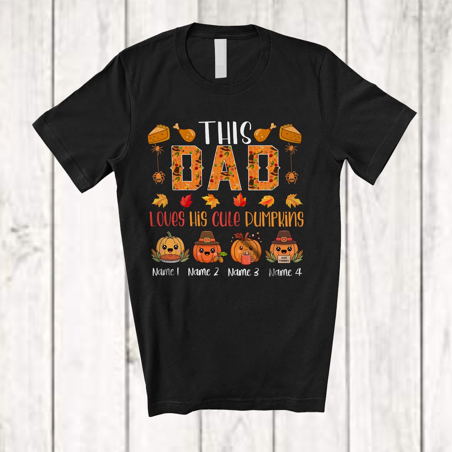 Personalized Custom Name Dad Loves His Cute Pumpkins; Lovely Thanksgiving Fall Leaf Family T-Shirt. This cotton t-shirt is a durable staple product with a classic fit. One of the most popular items, it has a relaxed style made for everyday and casual wear.