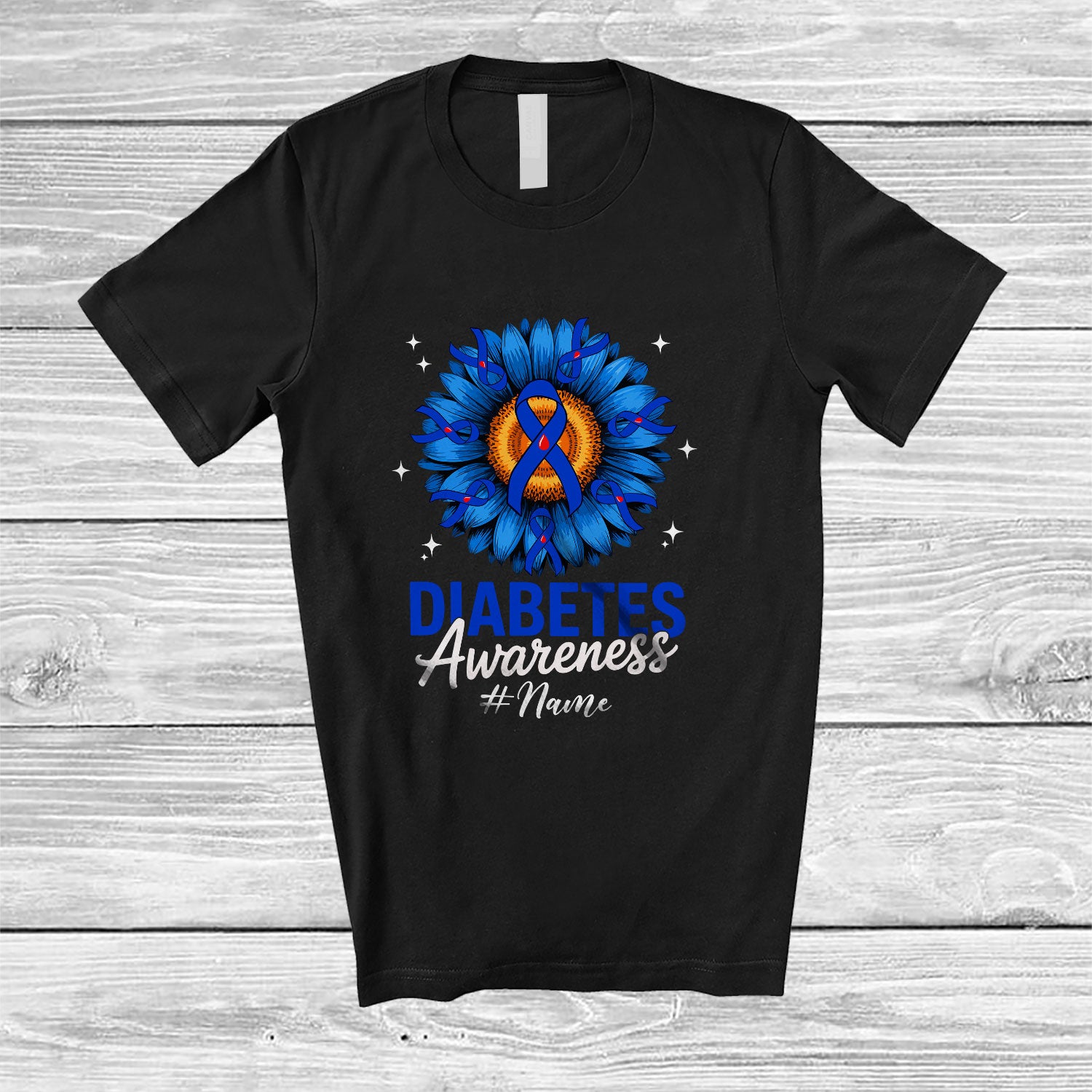 • Personalized Custom Name Diabetes Awareness; Lovely Blue Ribbon Daisy Flower; Family Group T-Shirt. This cotton t-shirt is a durable staple product with a classic fit. One of the most popular items, it has a relaxed style made for everyday and casual wear.
