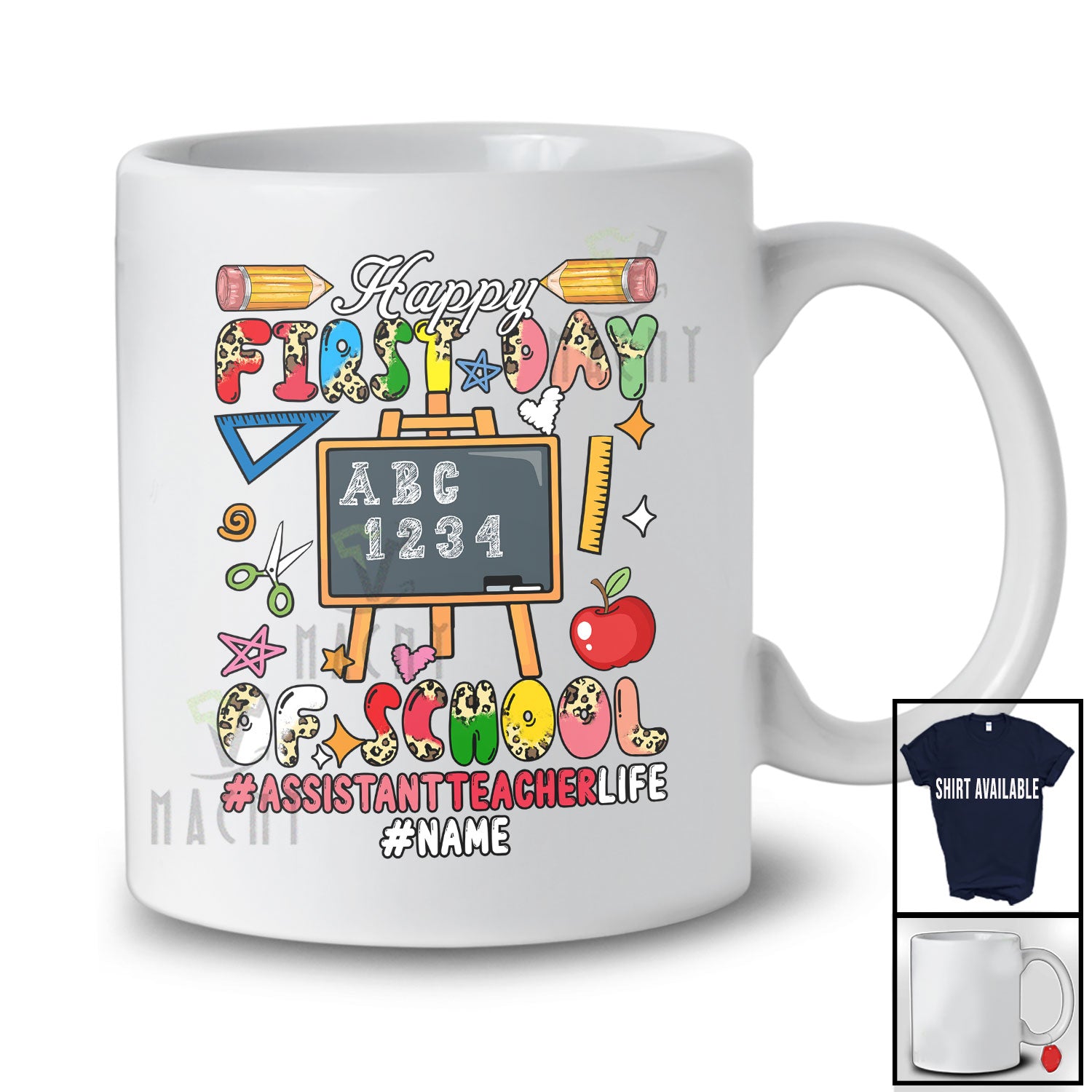 • Personalized Custom Name First Day Of School Assistant Teacher; Amusing Back To School Leopard T-Shirt. This cotton t-shirt is a durable staple product with a classic fit. One of the most popular items, it has a relaxed style made for everyday and casual wear.
