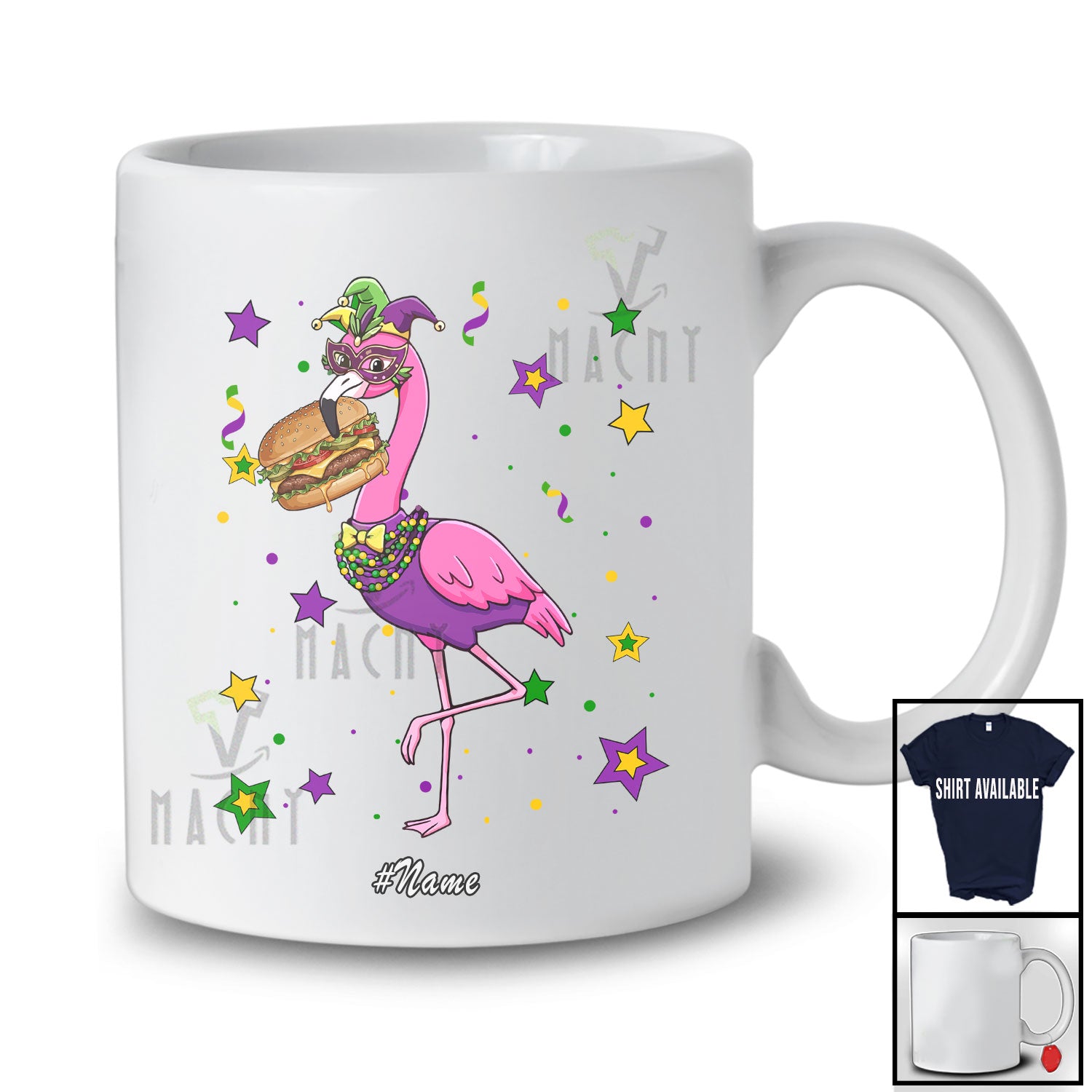 • Personalized Custom Name Flamingo Masked Eating Hamburger; Joyful Mardi Gras Beads Food T-Shirt. This cotton t-shirt is a durable staple product with a classic fit. One of the most popular items, it has a relaxed style made for everyday and casual wear.