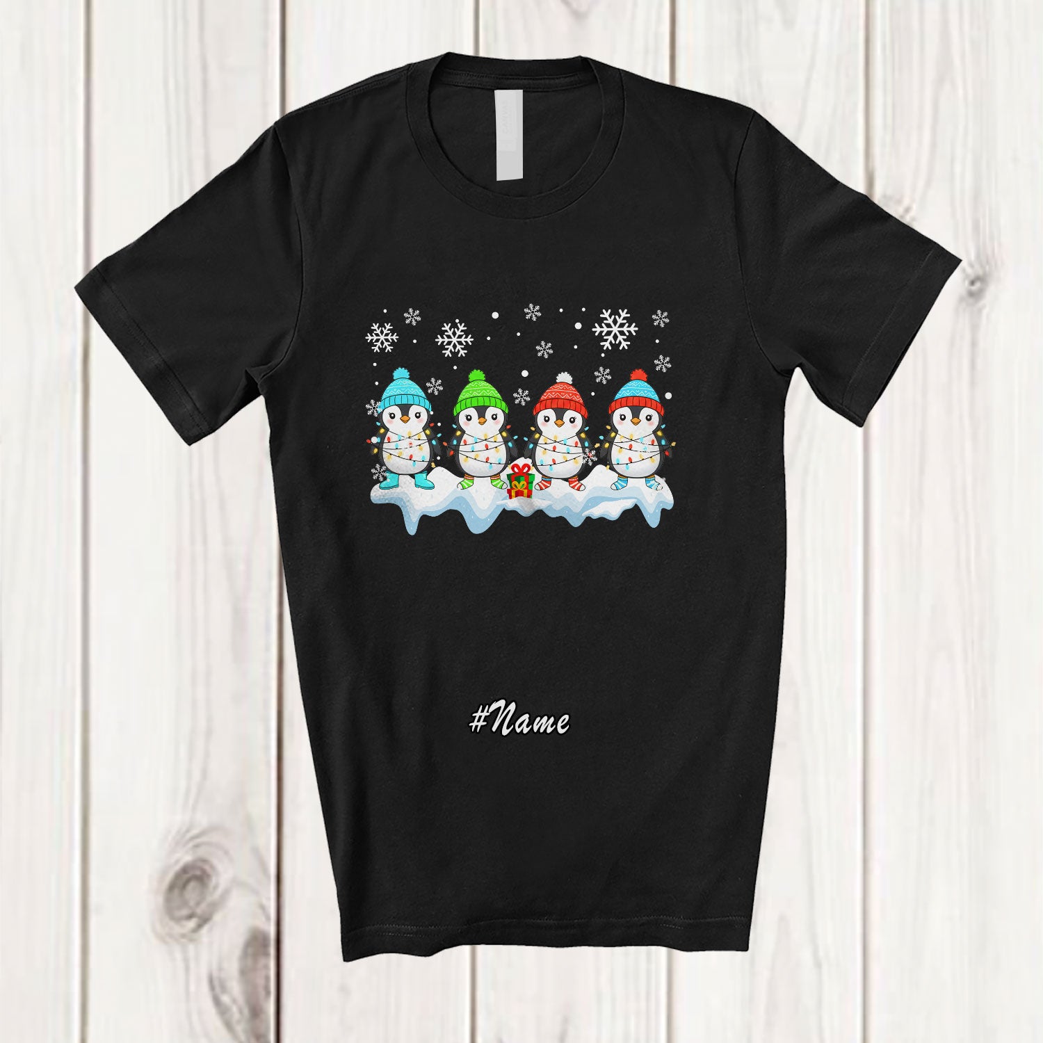 Personalized Custom Name Four X-mas Penguin; Adorable Christmas Lights Penguin Bird Animal T-Shirt