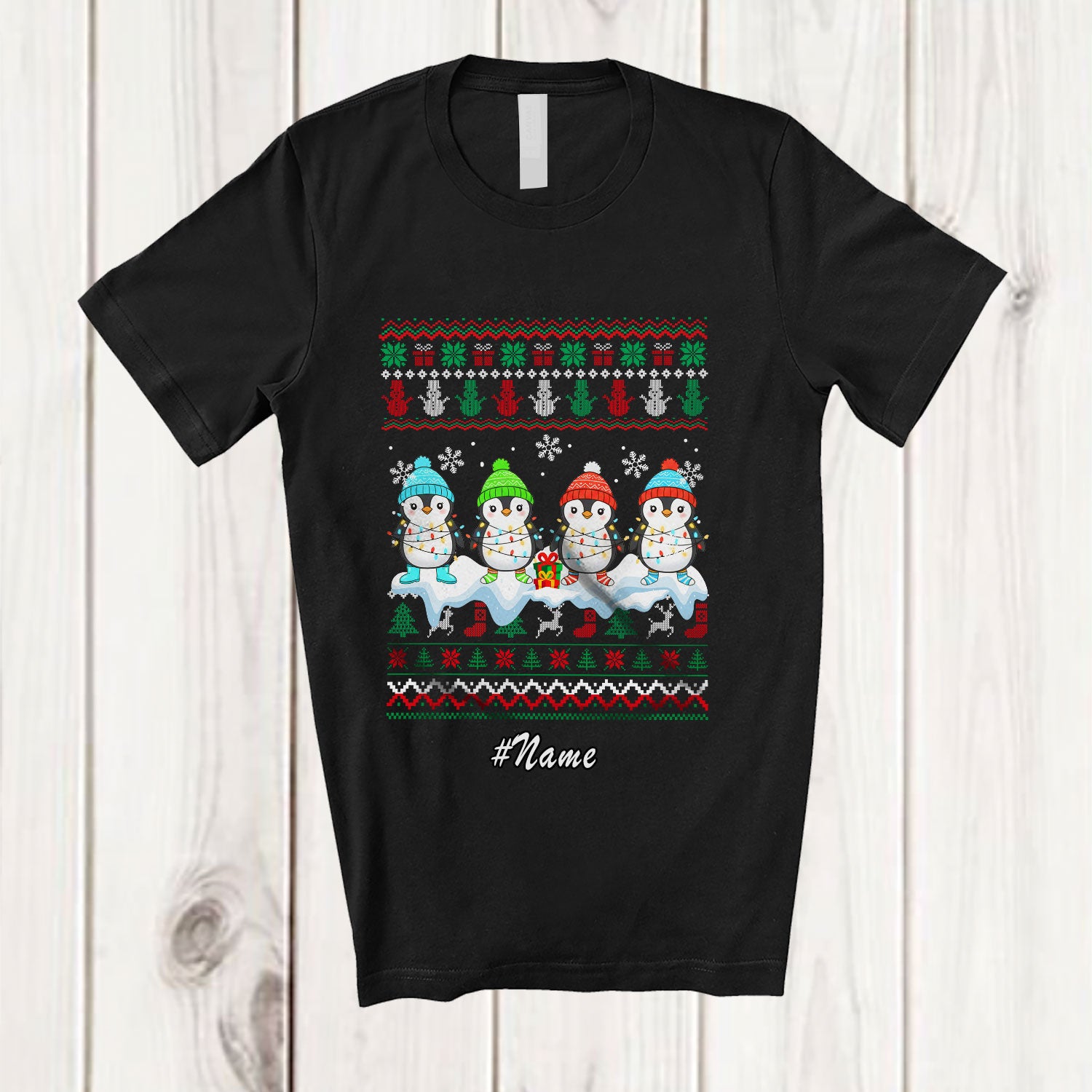 Personalized Custom Name Four X-mas Penguin; Adorable Christmas Lights Sweater Bird Animal T-Shirt