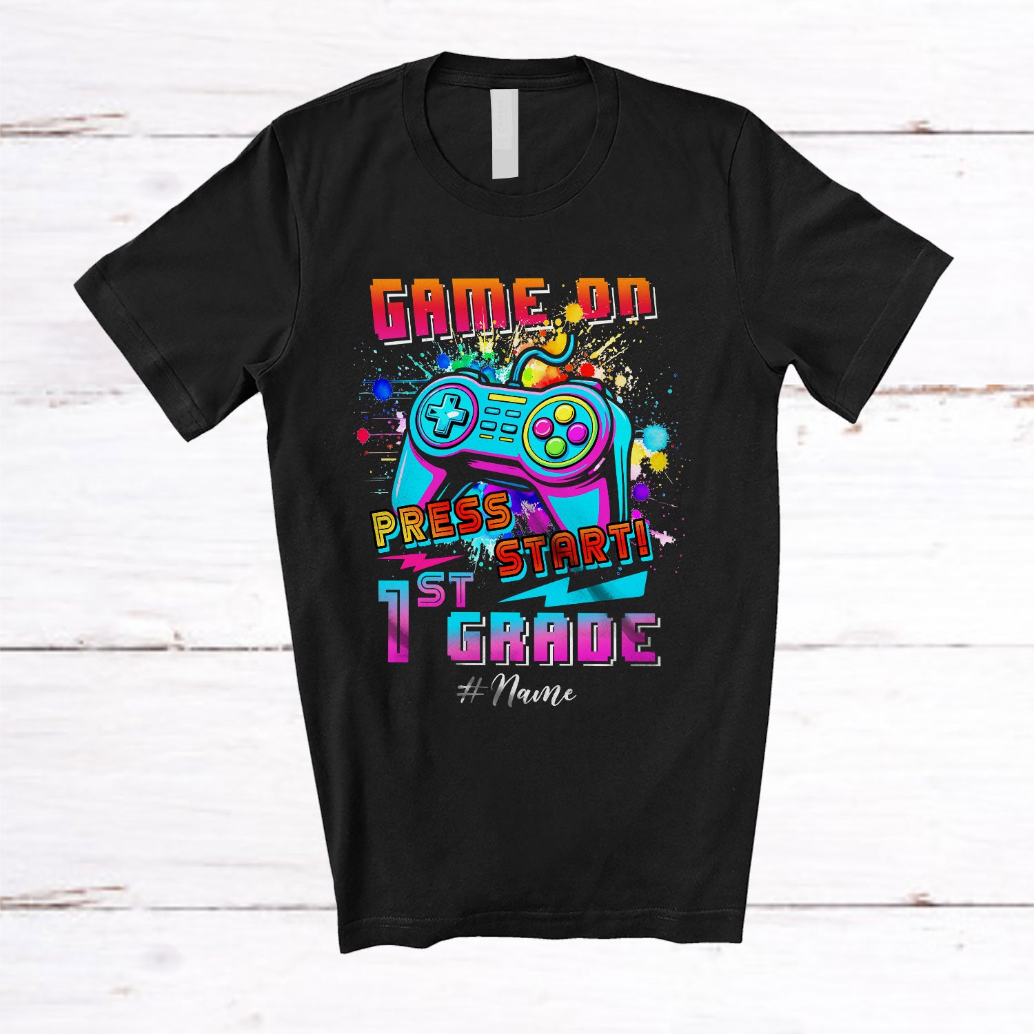 • Personalized Custom Name Game On Press Start 1st Grade; Joyful First Day Of School Boys Gamer T-Shirt. This cotton t-shirt is a durable staple product with a classic fit. One of the most popular items, it has a relaxed style made for everyday and casual wear.
