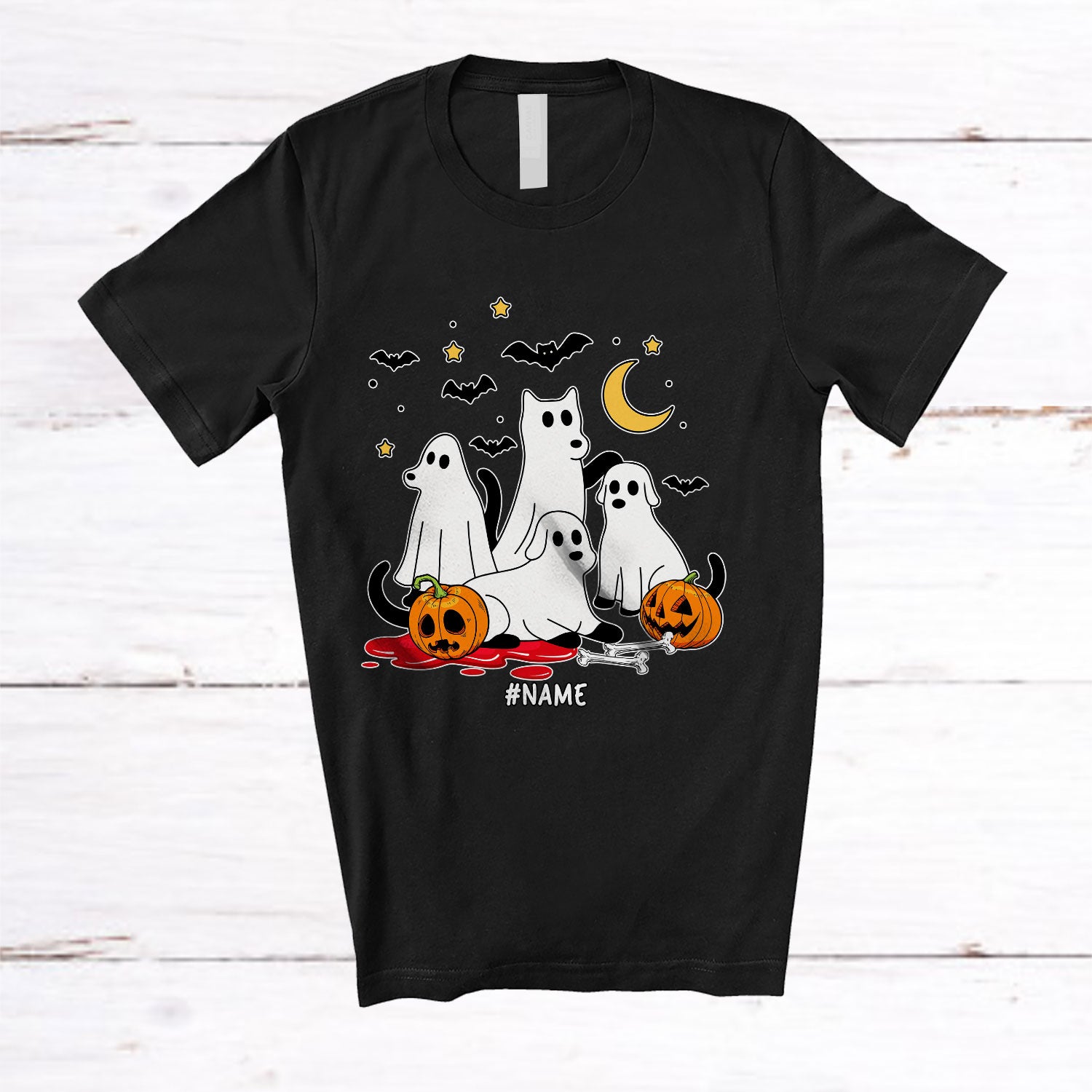Personalized Custom Name Ghost Dog Activities; Adorable Halloween Boo Dog Owner Lover T-Shirt. This cotton t-shirt is a durable staple product with a classic fit. One of the most popular items, it has a relaxed style made for everyday and casual wear.