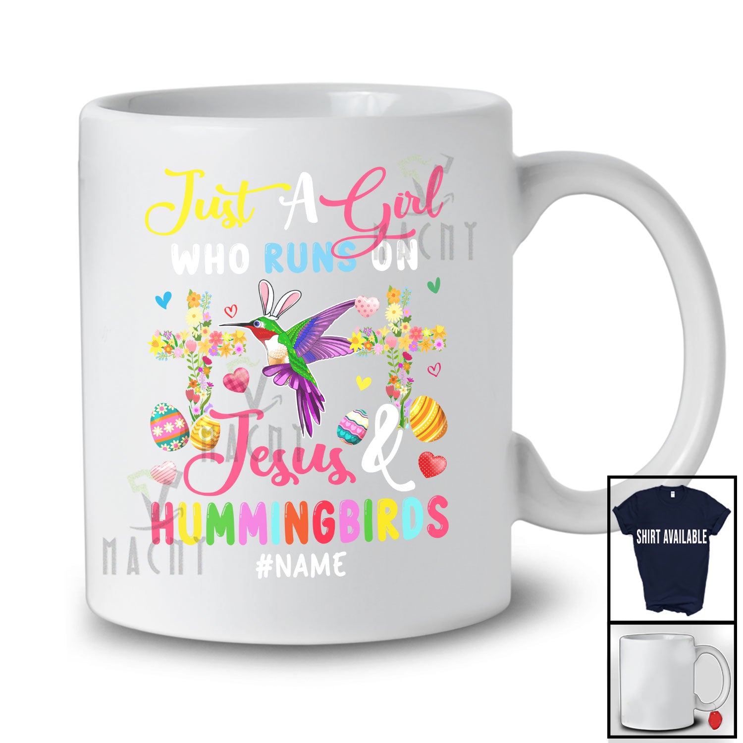 Personalized Custom Name Girl Who Runs On Jesus And Hummingbirds; Lovely Easter Egg Hunt T-Shirt. This cotton t-shirt is a durable staple product with a classic fit. One of the most popular items, it has a relaxed style made for everyday and casual wear.