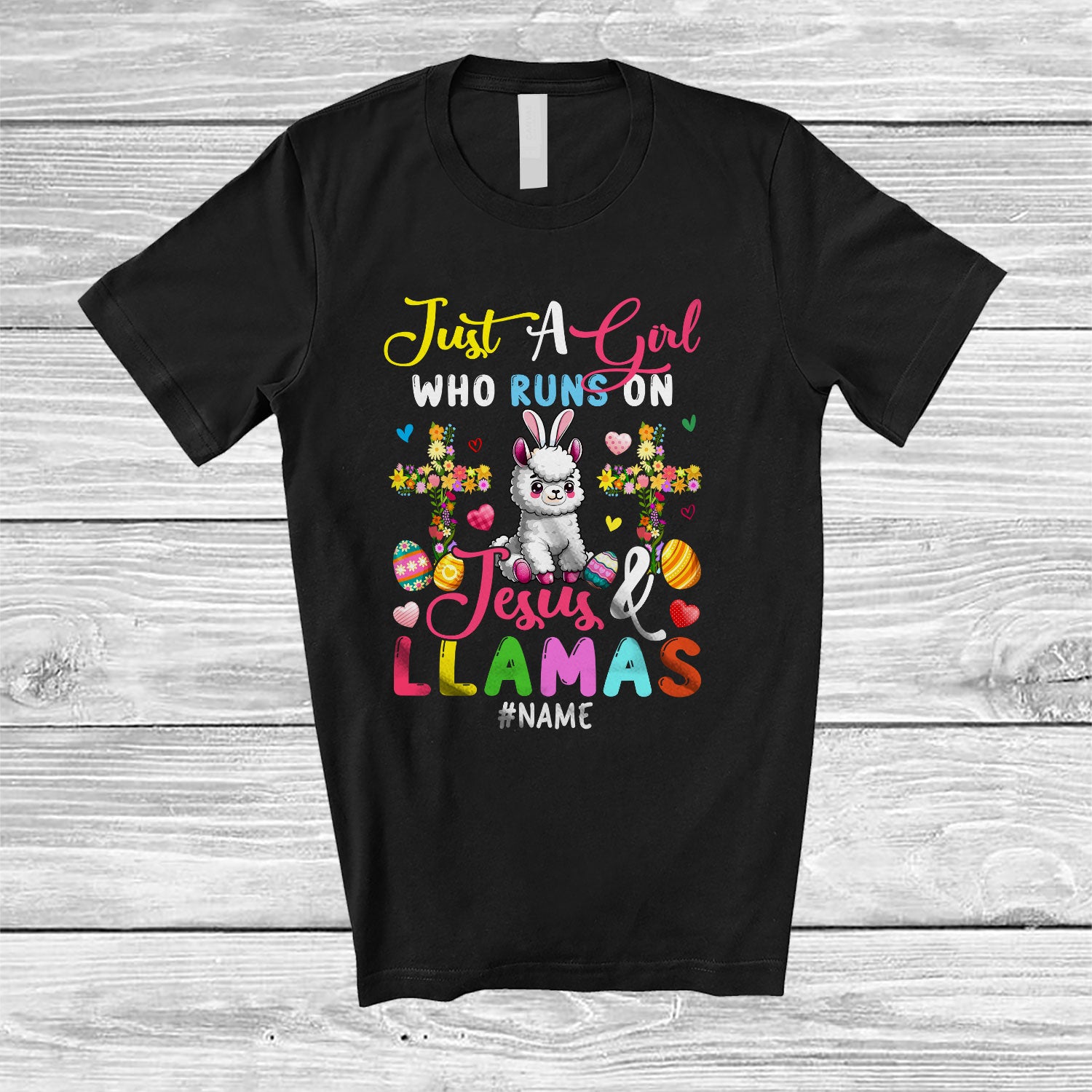 Personalized Custom Name Girl Who Runs On Jesus And Llamas; Lovely Easter Llama Egg Hunt T-Shirt. This cotton t-shirt is a durable staple product with a classic fit. One of the most popular items, it has a relaxed style made for everyday and casual wear.