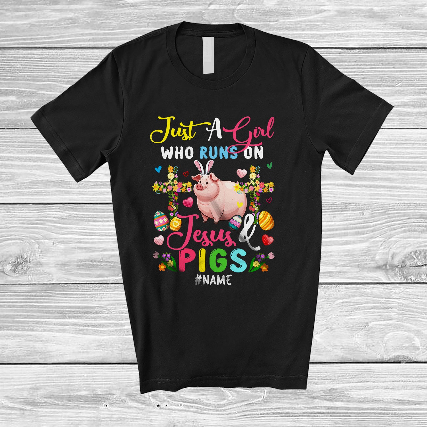 • Personalized Custom Name Girl Who Runs On Jesus And Pigs; Lovely Easter Pig Egg Hunt T-Shirt. This cotton t-shirt is a durable staple product with a classic fit. One of the most popular items, it has a relaxed style made for everyday and casual wear.