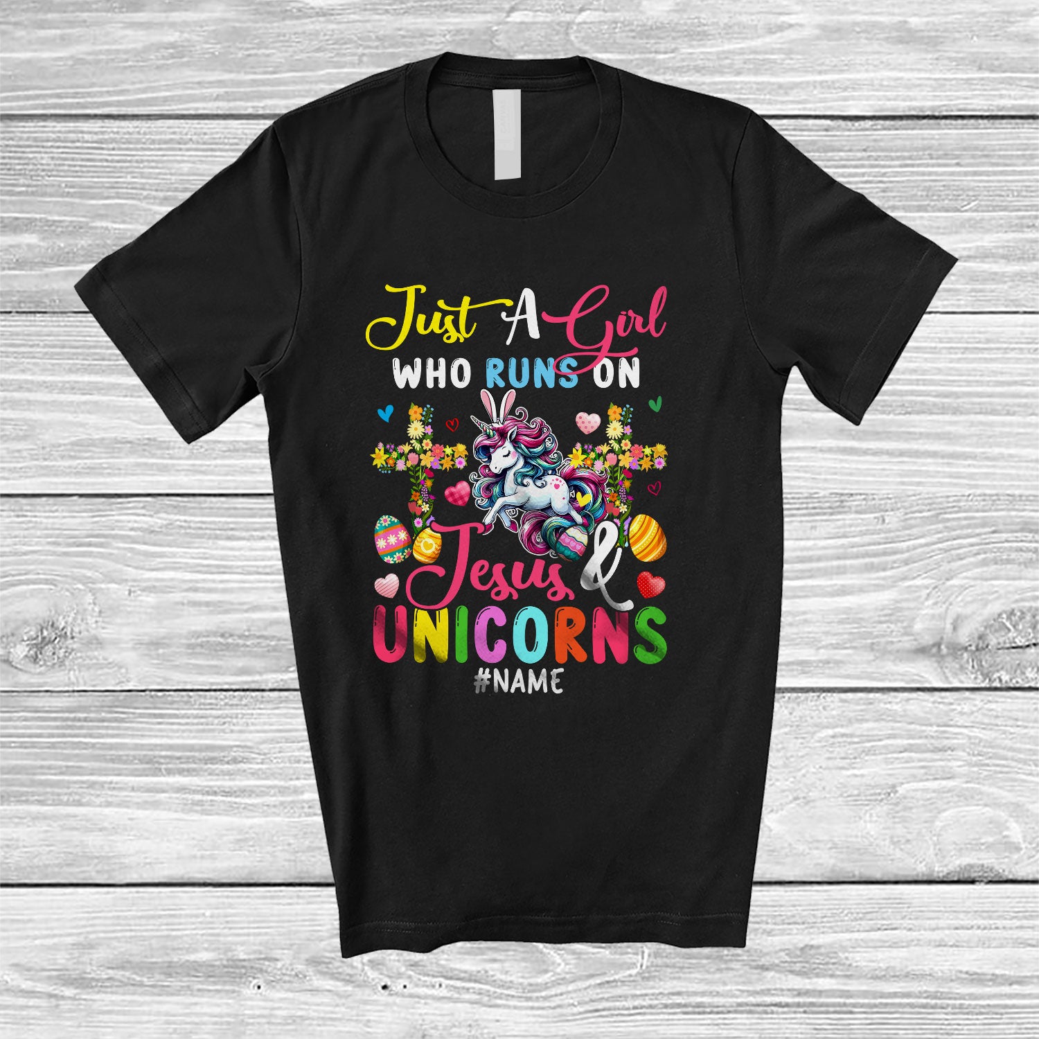 Personalized Custom Name Girl Who Runs On Jesus And Unicorns; Lovely Easter Unicorn Egg Hunt T-Shirt. This cotton t-shirt is a durable staple product with a classic fit. One of the most popular items, it has a relaxed style made for everyday and casual wear.