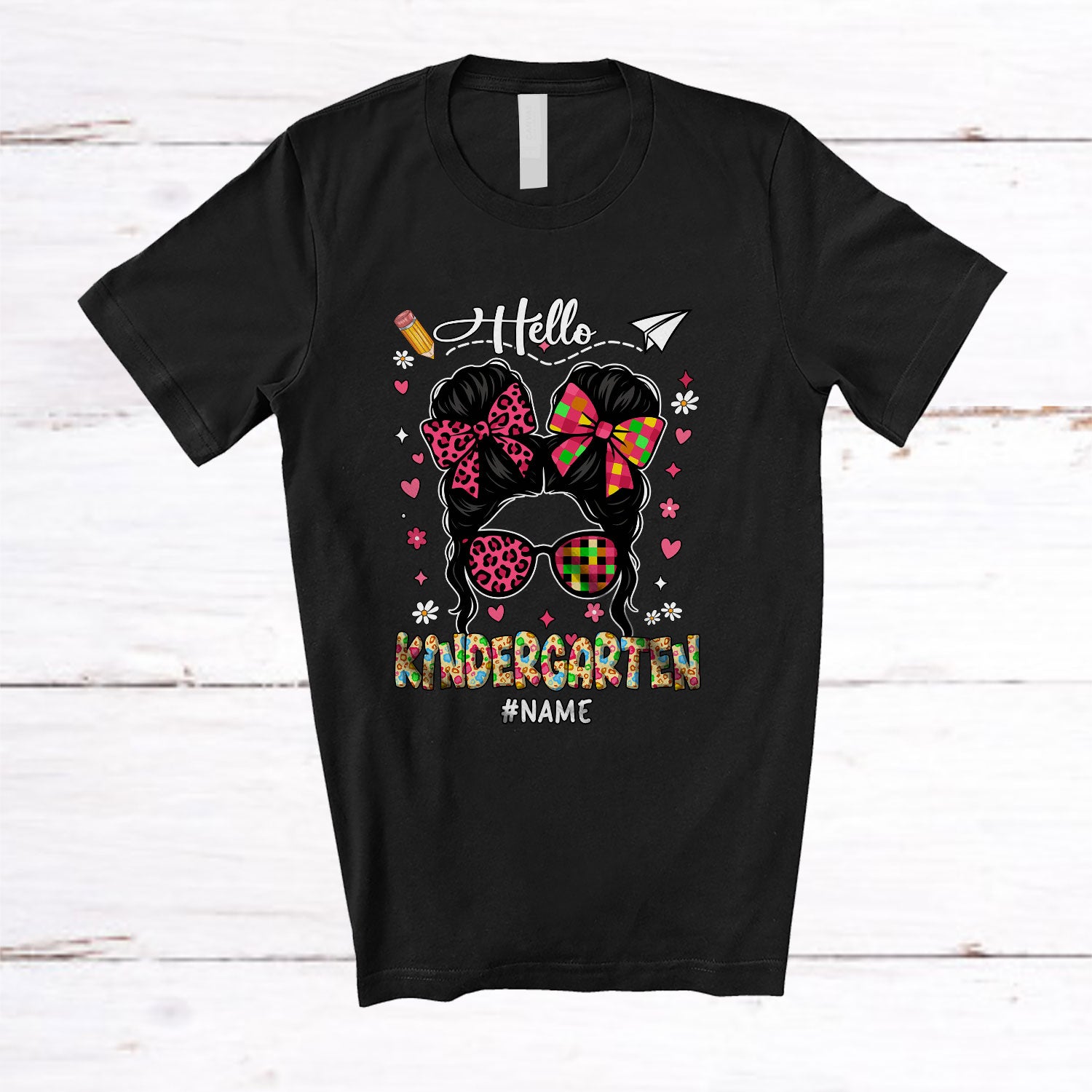new MacnyStore - Personalized Custom Name Hello Kindergarten; Lovely First Day Of School Messy Bun Girls Coquette T-Shirt – Macnystore