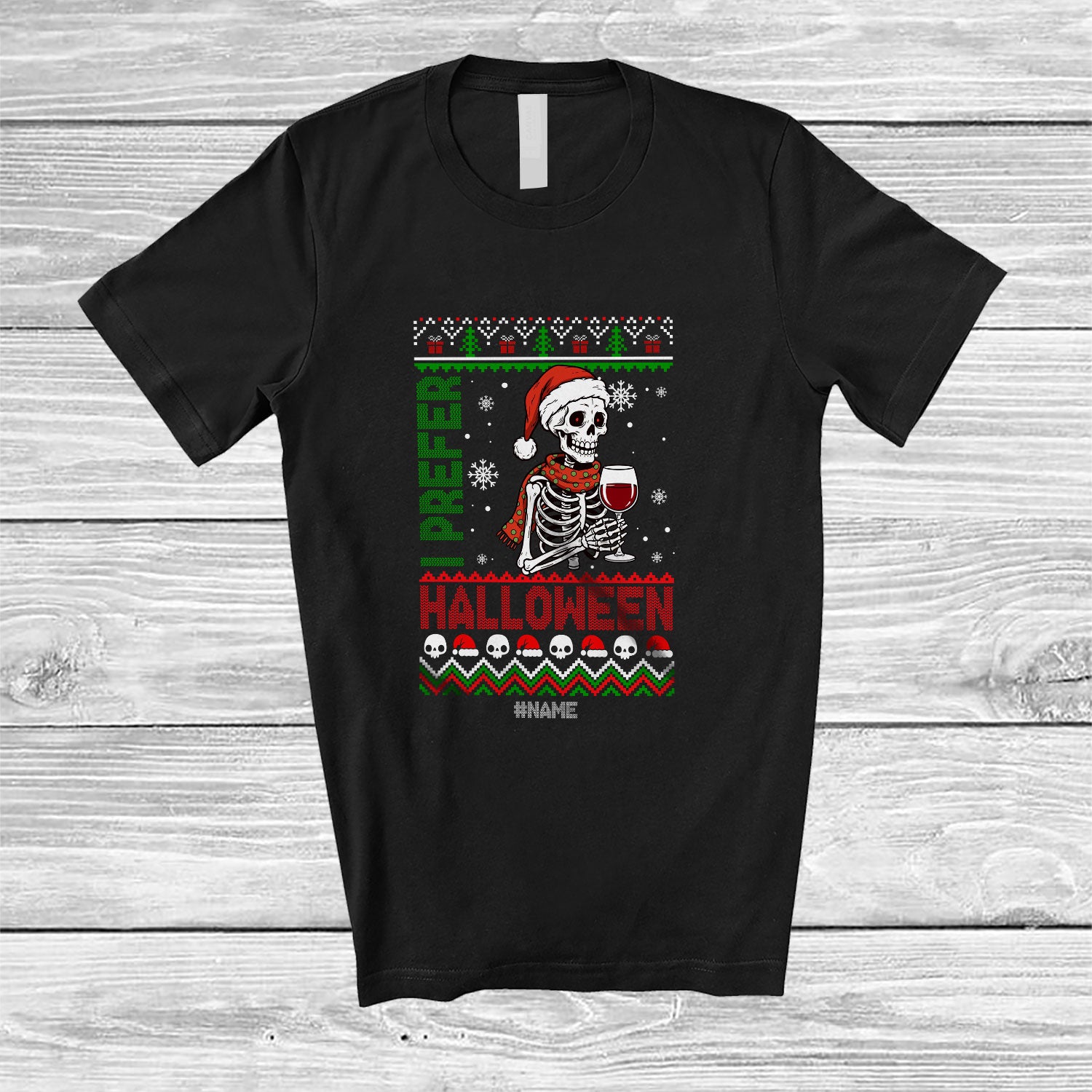 Personalized Custom Name I Prefer Halloween; Amazing Christmas Sweater Skeleton Drinking Wine T-Shirt