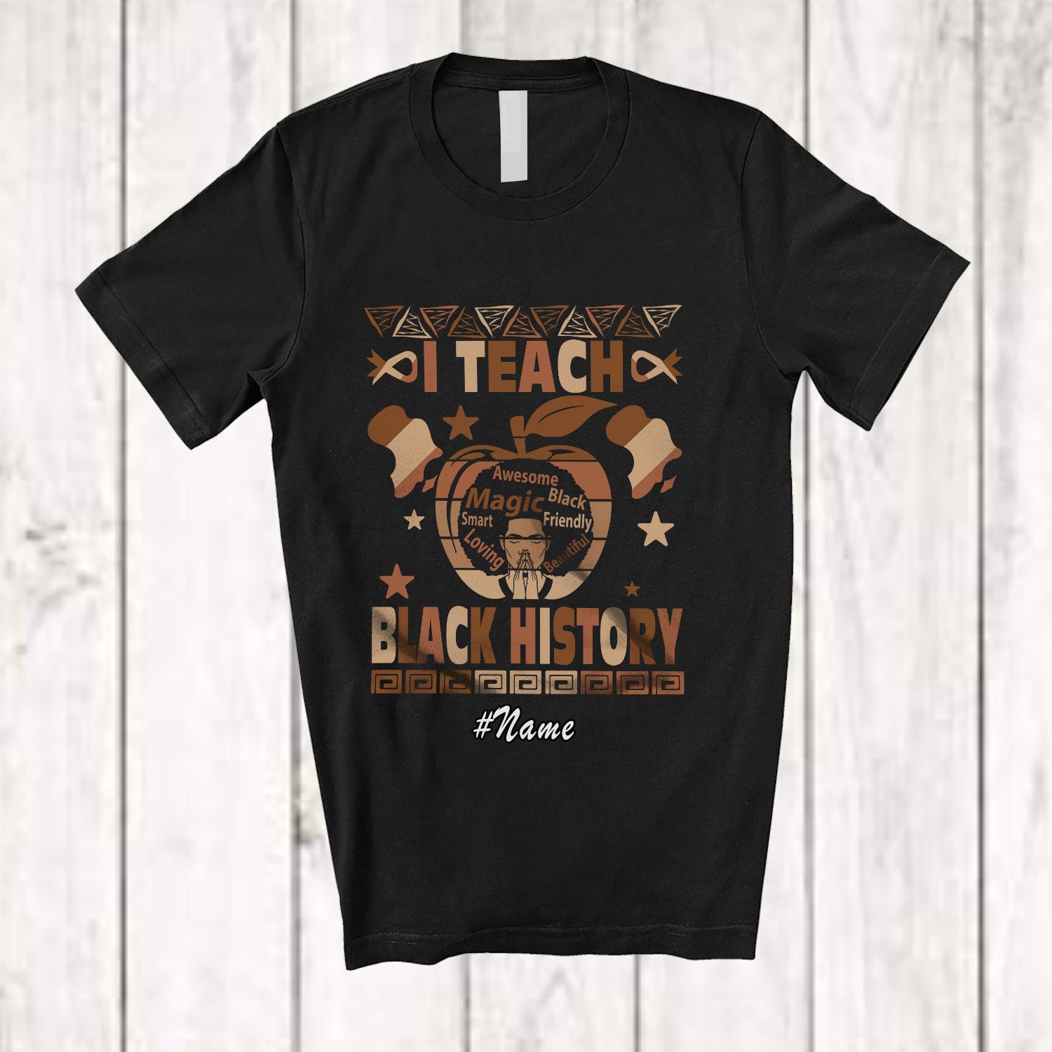 • Personalized Custom Name I Teach Black History; Humorous Afro Men Teacher; African Melanin T-Shirt. This cotton t-shirt is a durable staple product with a classic fit. One of the most popular items, it has a relaxed style made for everyday and casual wear.