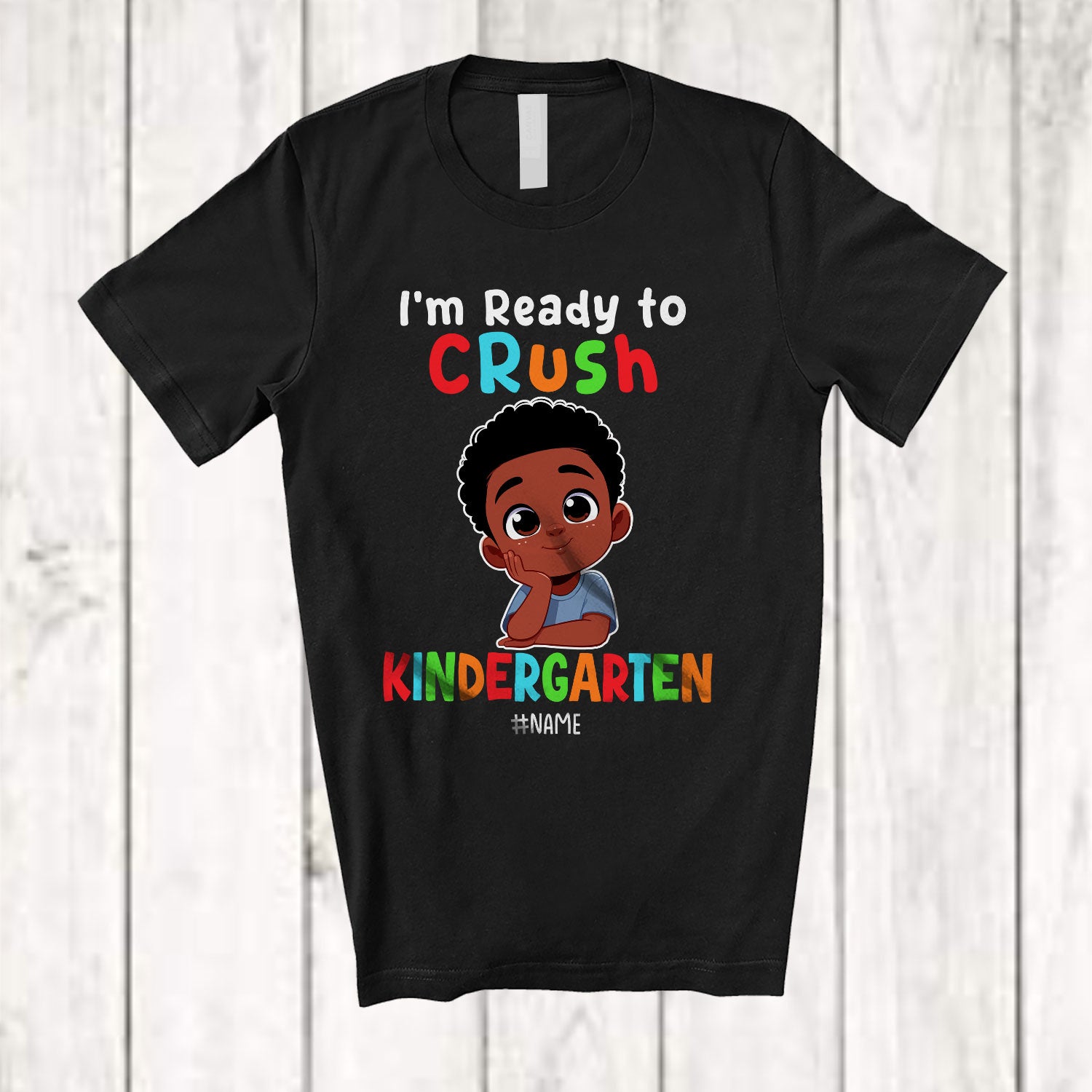 Personalized Custom Name I'm Ready To Crush Kindergarten; Lovely Back To School Afro Boy Students T-Shirt. This cotton t-shirt is a durable staple product with a classic fit. One of the most popular items, it has a relaxed style made for everyday and casual wear.