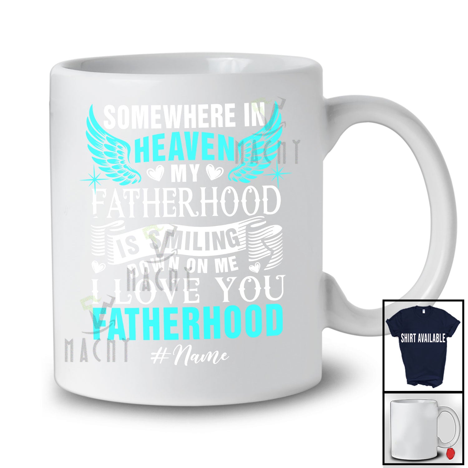 • Personalized Custom Name In Heaven My Fatherhood Is Smiling; Lovely Father's Day Wings Family T-Shirt. This cotton t-shirt is a durable staple product with a classic fit. One of the most popular items, it has a relaxed style made for everyday and casual wear.