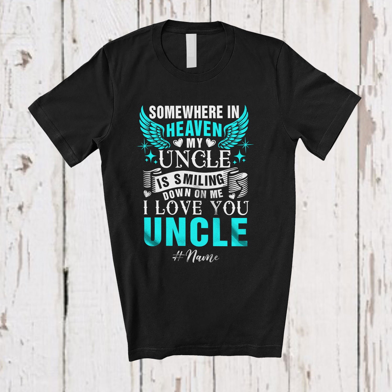Personalized Custom Name In Heaven My Uncle Is Smiling; Lovely Father's Day Wings Family T-Shirt. This cotton t-shirt is a durable staple product with a classic fit. One of the most popular items, it has a relaxed style made for everyday and casual wear.