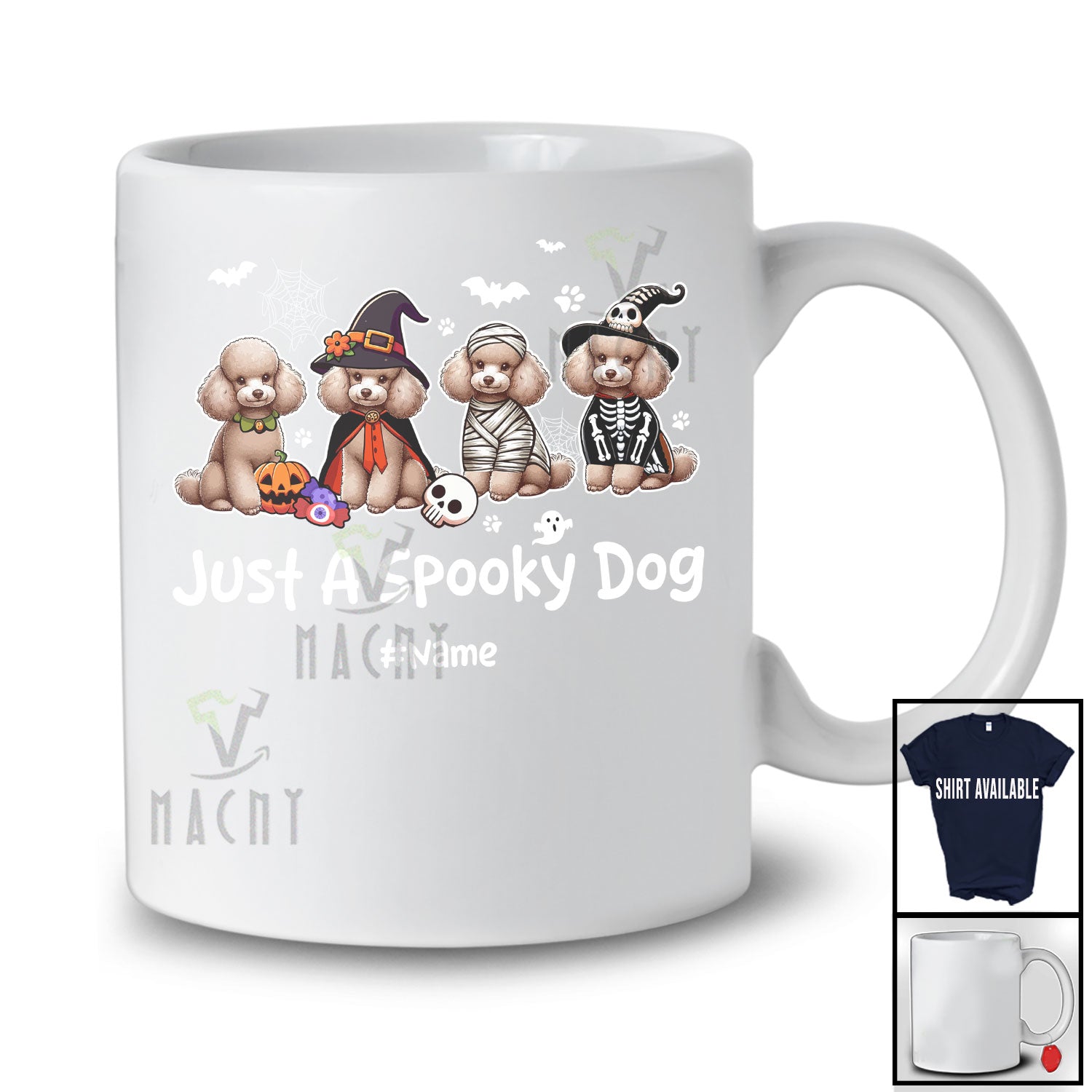 Personalized Custom Name Just A Spooky Dog; Horror Halloween Witch Skeleton Poodle Paws T-Shirt. This cotton t-shirt is a durable staple product with a classic fit. One of the most popular items, it has a relaxed style made for everyday and casual wear.
