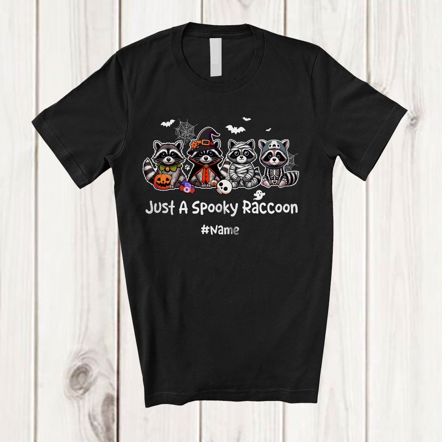 • Personalized Custom Name Just A Spooky Raccoon; Horror Halloween Witch Skeleton Raccoon T-Shirt. This cotton t-shirt is a durable staple product with a classic fit. One of the most popular items, it has a relaxed style made for everyday and casual wear.