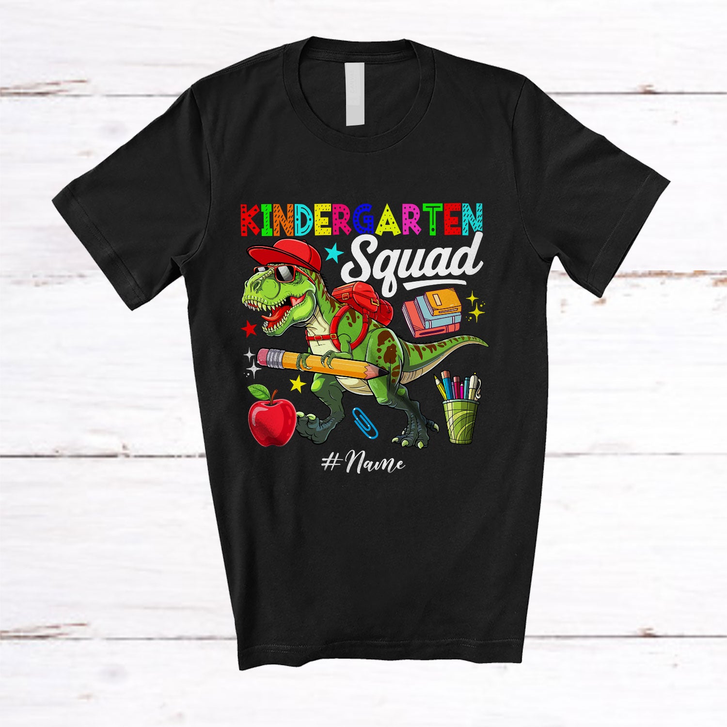 • Personalized Custom Name Kindergarten Squad; Lovely First Day Of School Student Teacher T-Rex T-Shirt. This cotton t-shirt is a durable staple product with a classic fit. One of the most popular items, it has a relaxed style made for everyday and casual wear.