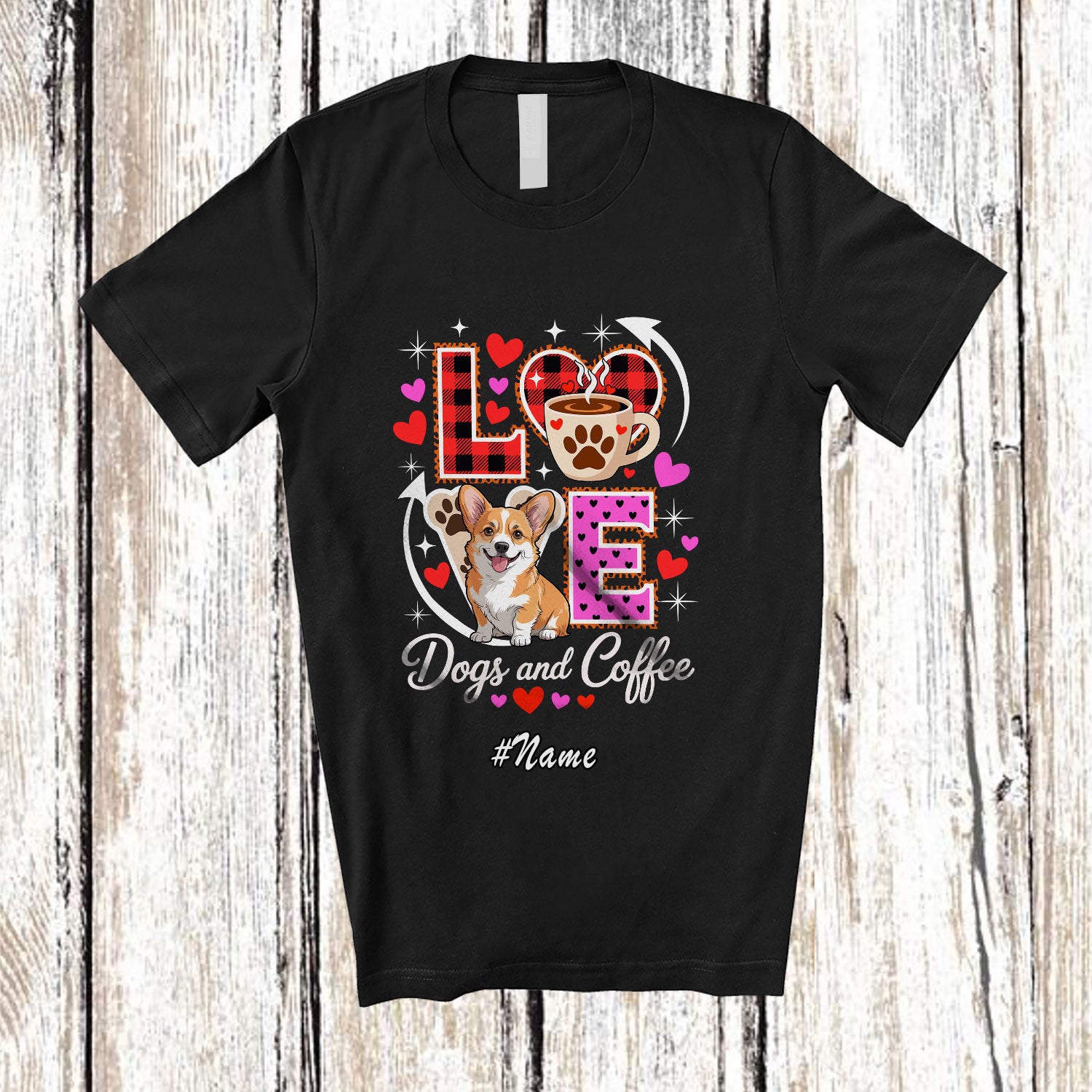Personalized Custom Name LOVE Dog And Coffee; Lovely Valentine's Day Plaid Heart Corgi T-Shirt. This cotton t-shirt is a durable staple product with a classic fit. One of the most popular items, it has a relaxed style made for everyday and casual wear.