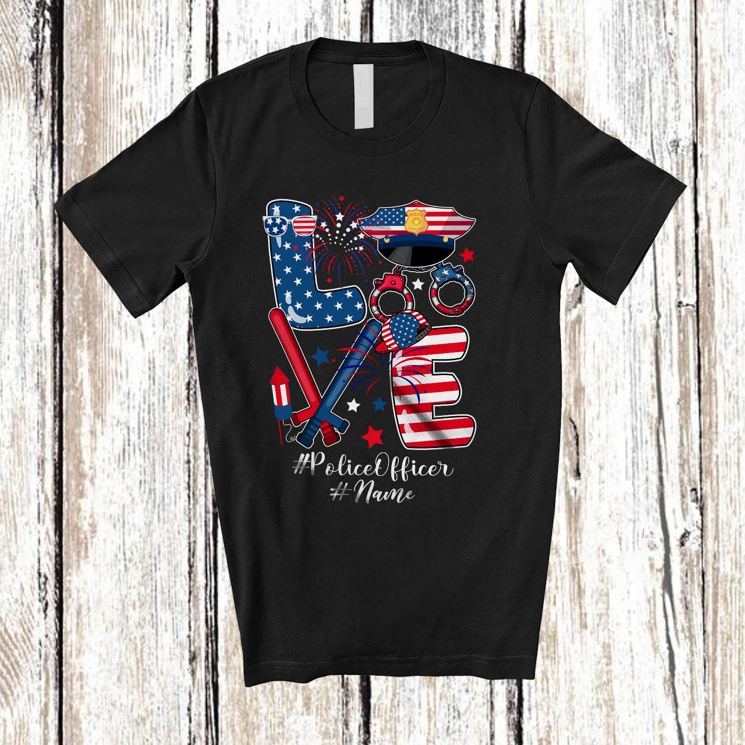 Personalized Custom Name Love Police Officer; Proud 4th Of July American Flag; Patriotic T-Shirt