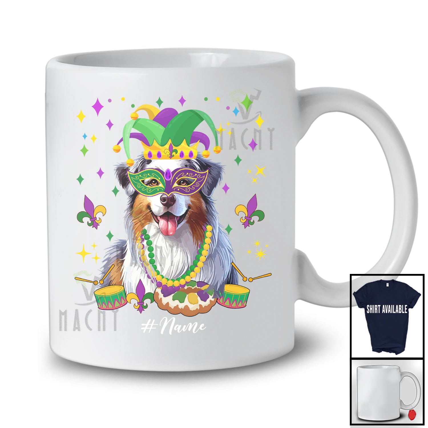 • Personalized Custom Name Mardi Gras Mask Australian Shepherd Face; Joyful Parades Jester Hat Beads T-Shirt. This cotton t-shirt is a durable staple product with a classic fit. One of the most popular items, it has a relaxed style made for everyday and casual wear.