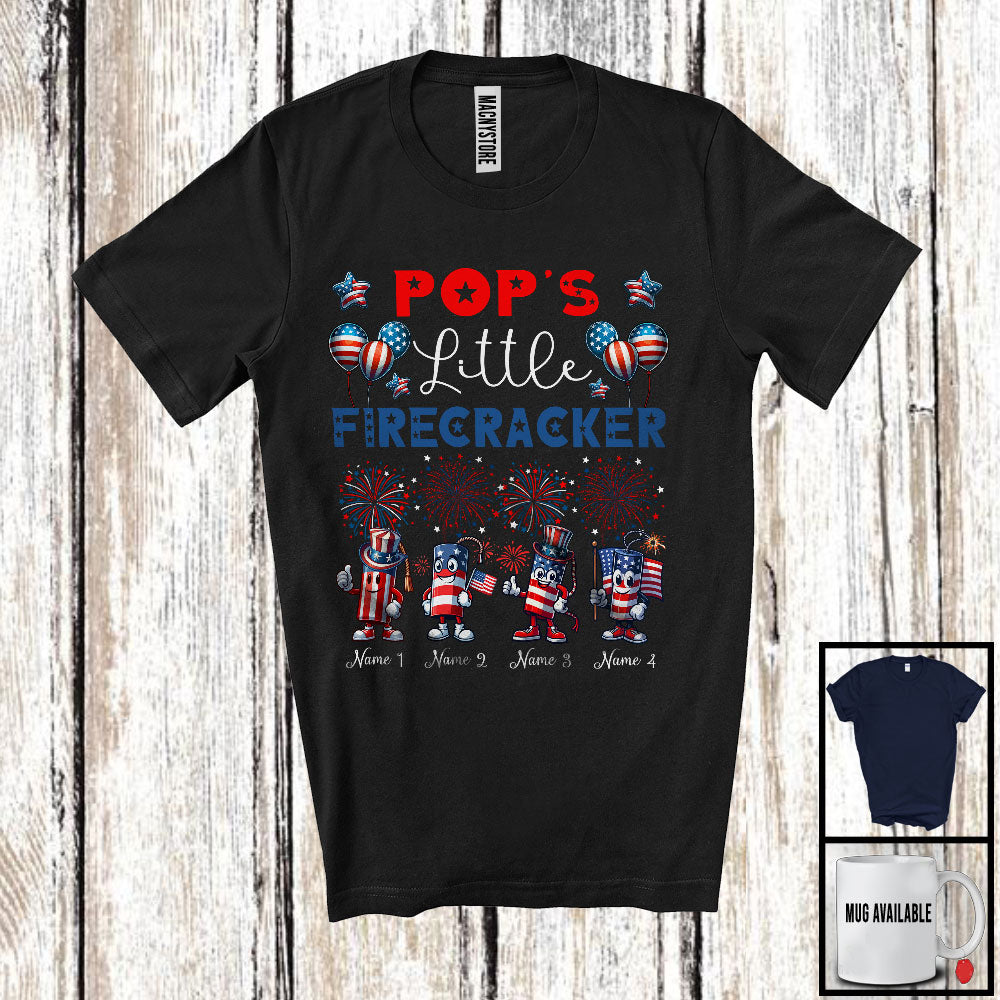 • Personalized Custom Name Pop's Little Firecracker, Proud 4th Of July Fireworks, Patriotic T-Shirt. This cotton t-shirt is a durable staple product with a classic fit. One of the most popular items, it has a relaxed style made for everyday and casual wear.