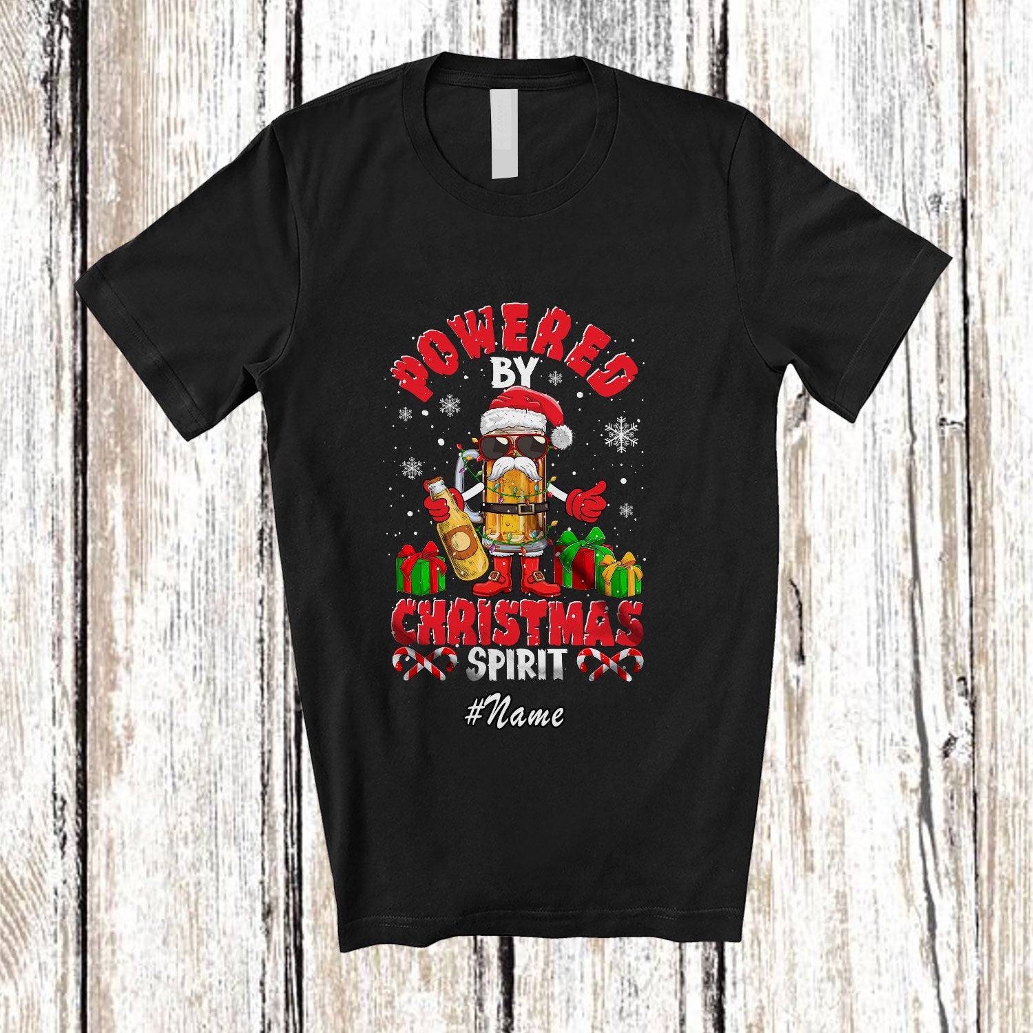Personalized Custom Name Powered By Christmas Spirit; Cheerful Beer Glass; Drunker Drinking T-Shirt. This cotton t-shirt is a durable staple product with a classic fit. One of the most popular items, it has a relaxed style made for everyday and casual wear.