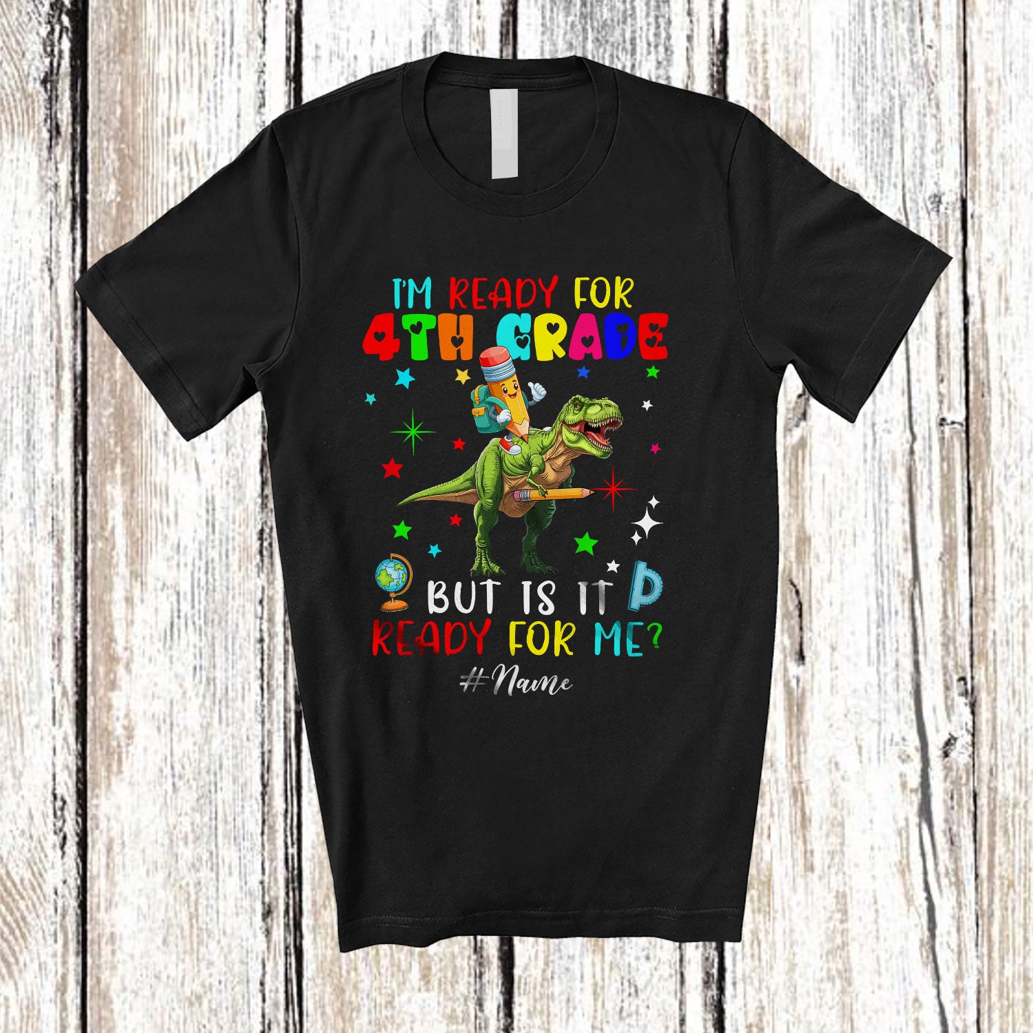 Personalized Custom Name Ready For 4th Grade; Amusing First Day Of School Pencil Riding T-Rex T-Shirt