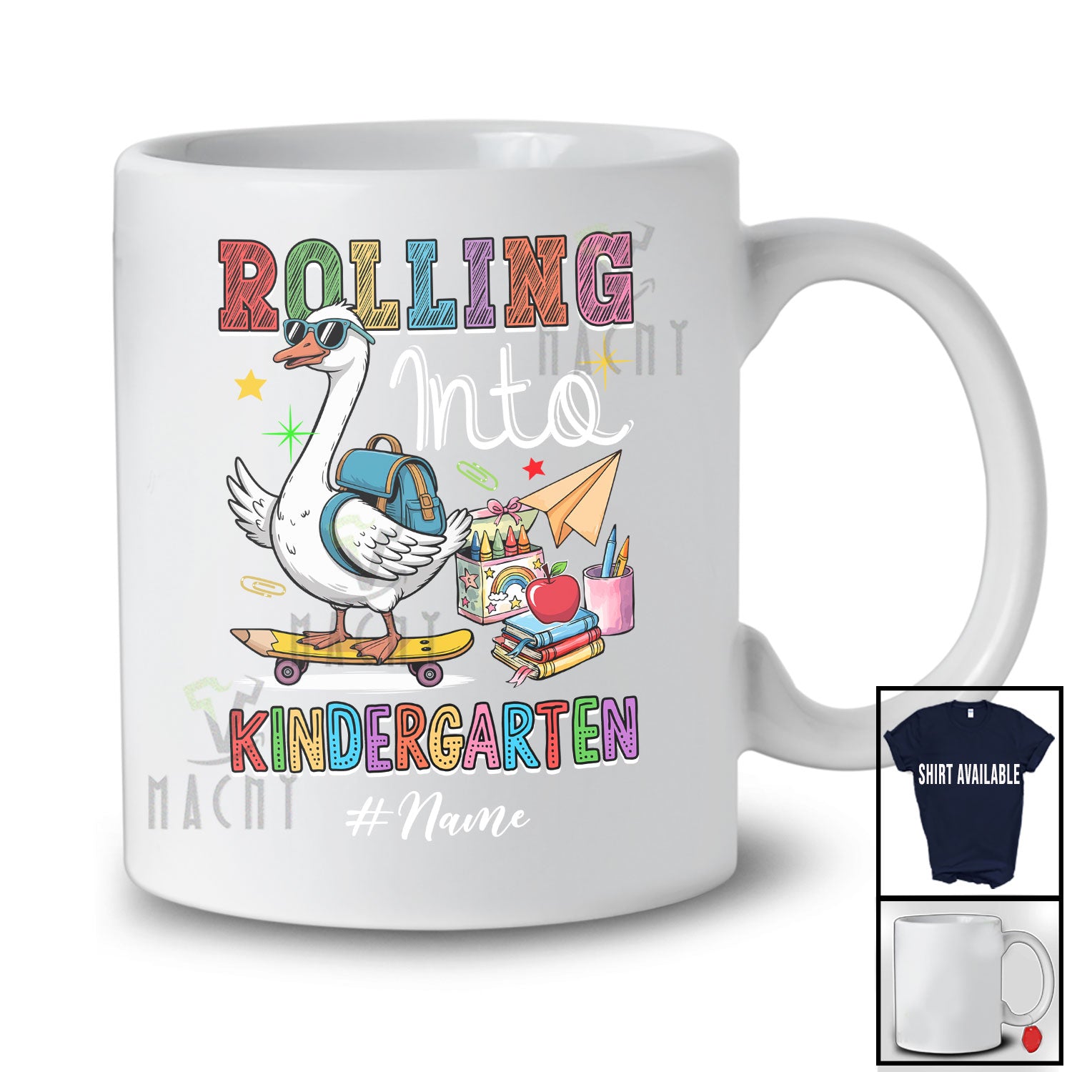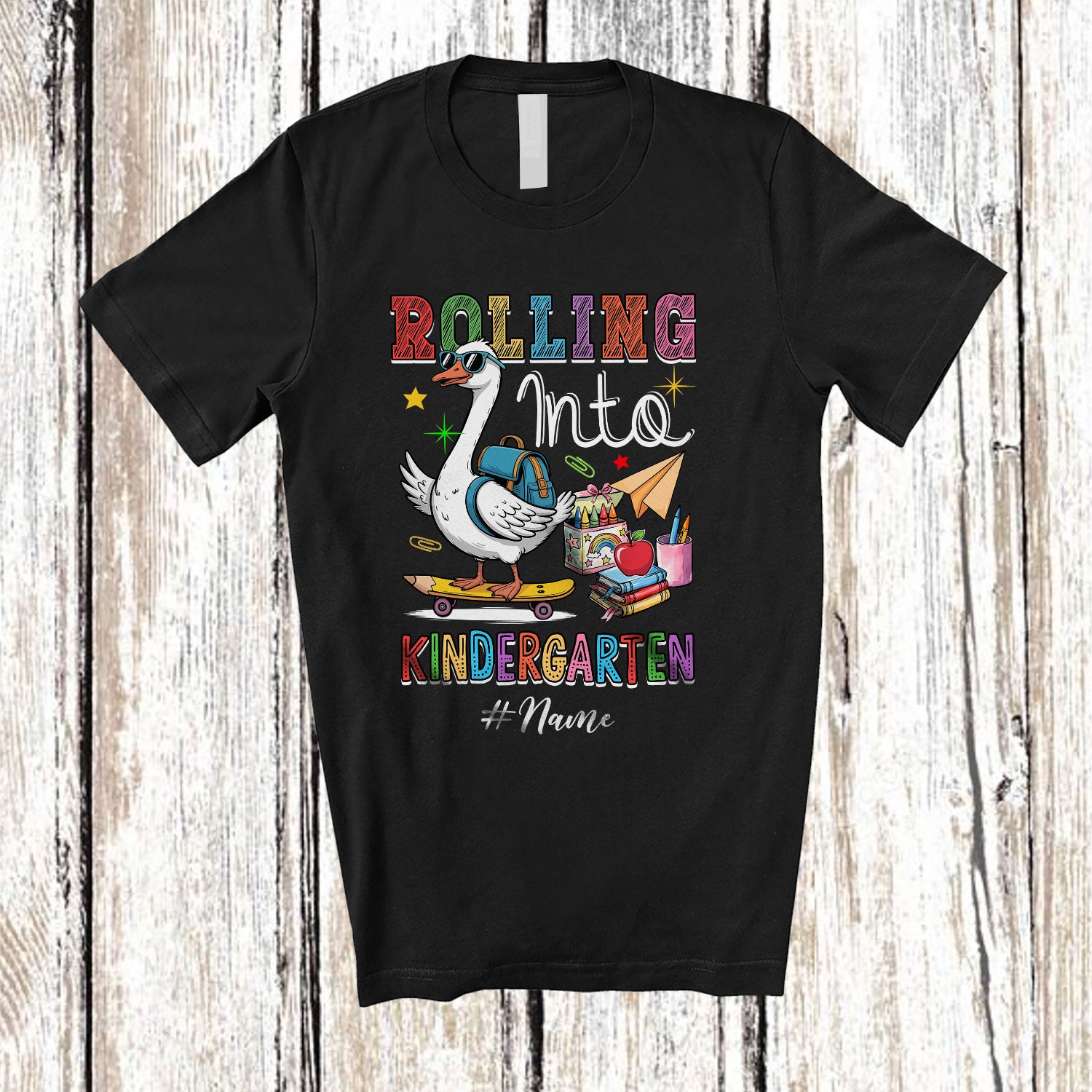 • Personalized Custom Name Rolling Into Kindergarten; Humorous First Day Of School Goose Skating T-Shirt. This cotton t-shirt is a durable staple product with a classic fit. One of the most popular items, it has a relaxed style made for everyday and casual wear.