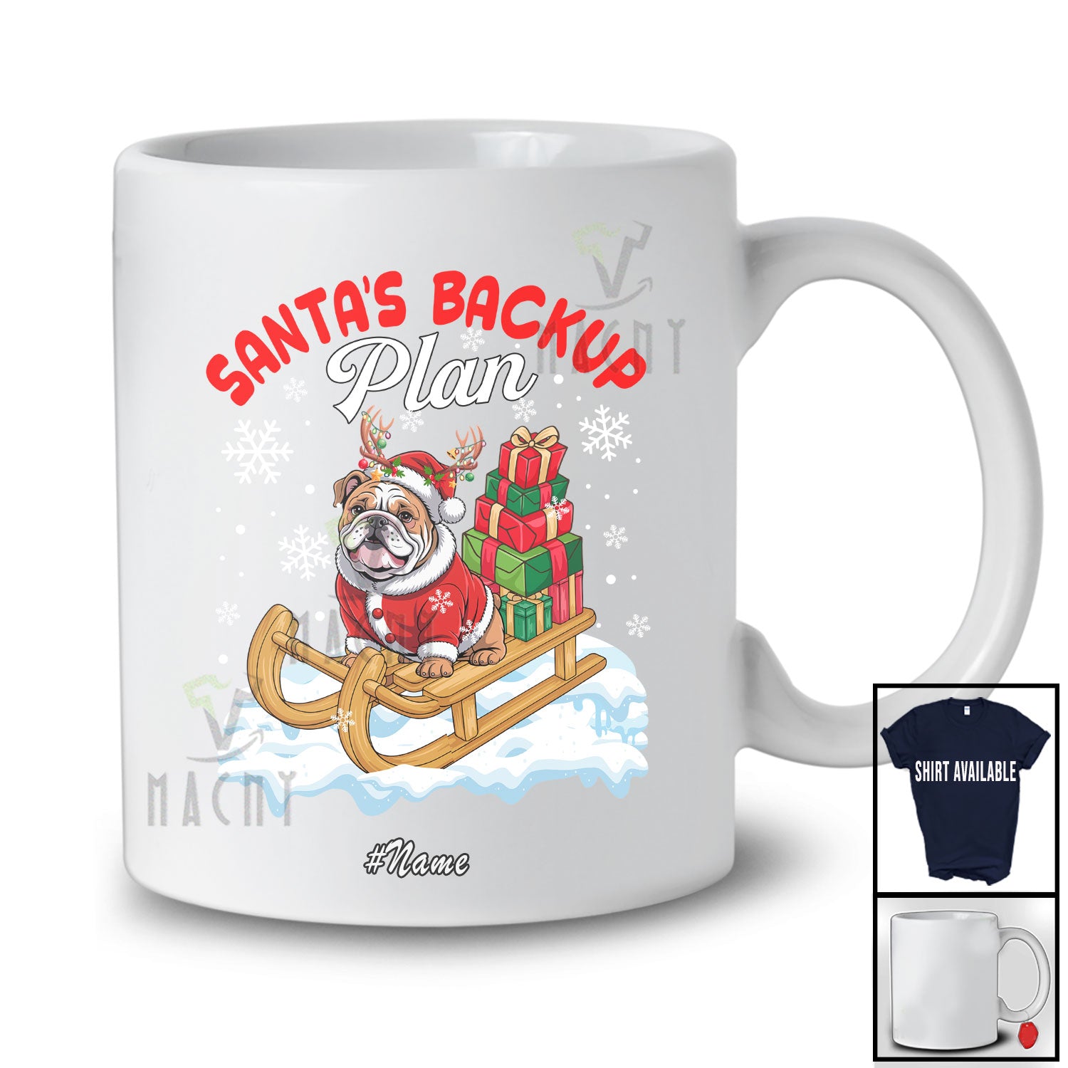 The Personalized Custom Name Santa's Backup Plan; Lovely Christmas Santa Sleigh Reindeer Bulldog T-Shirt destined to impress, and priced at only $12.95, for a limited time.