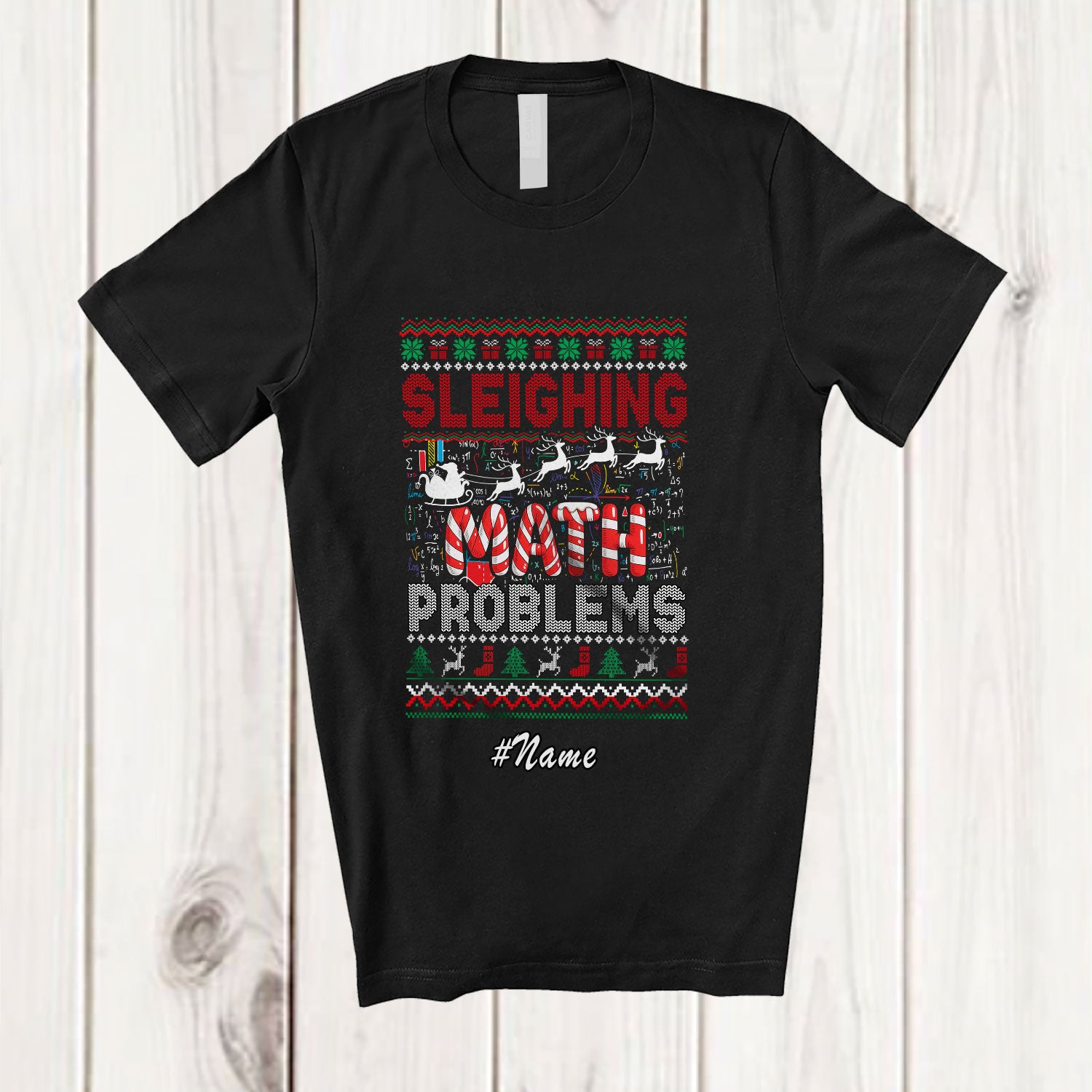 Personalized Custom Name Sleighing Math Problems; Joyful Christmas Sweater Students Teacher T-Shirt. This cotton t-shirt is a durable staple product with a classic fit. One of the most popular items, it has a relaxed style made for everyday and casual wear.