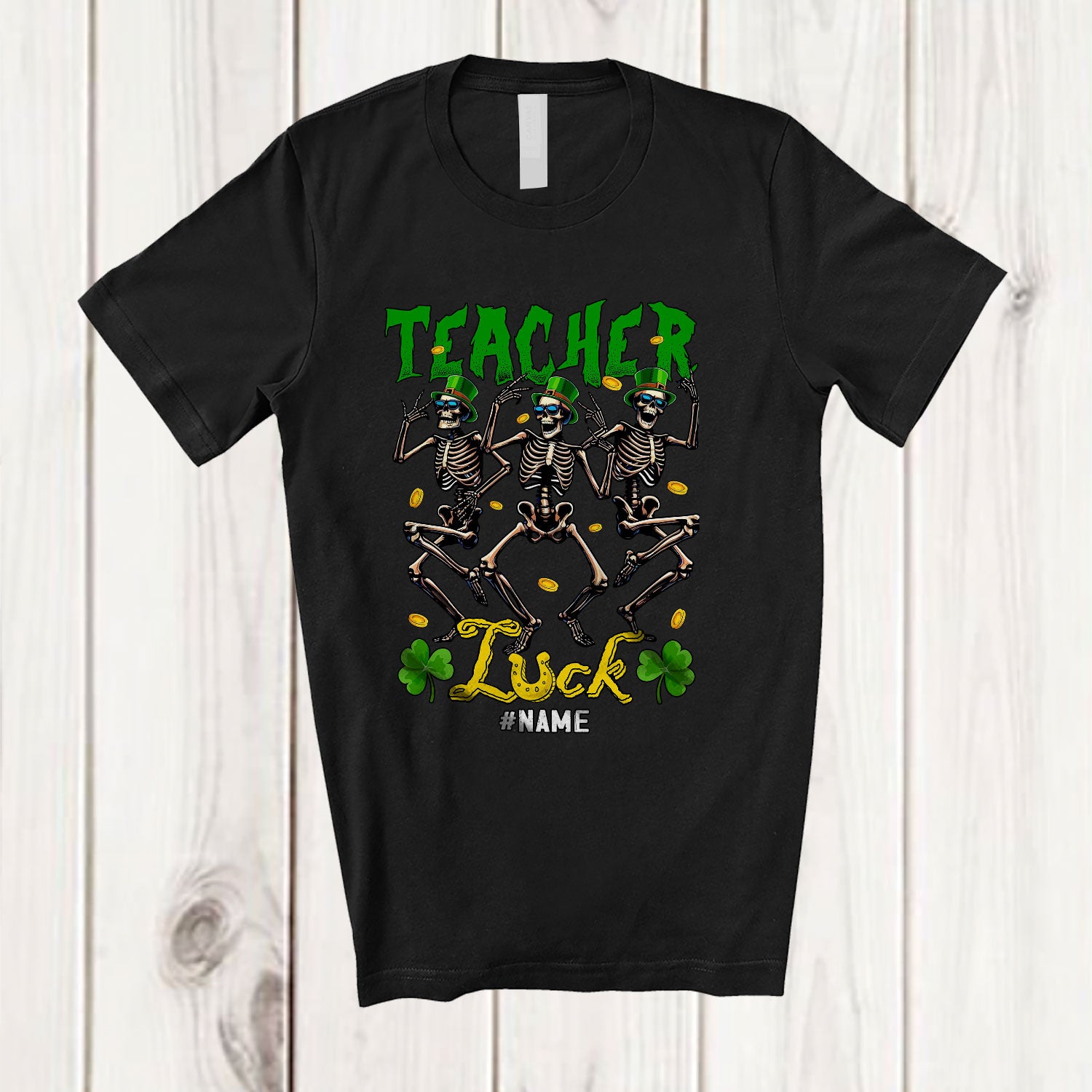 Personalized Custom Name Teacher Luck; Joyful St. Patrick's Three Skeletons; Lucky Shamrock T-Shirt. This cotton t-shirt is a durable staple product with a classic fit. One of the most popular items, it has a relaxed style made for everyday and casual wear.