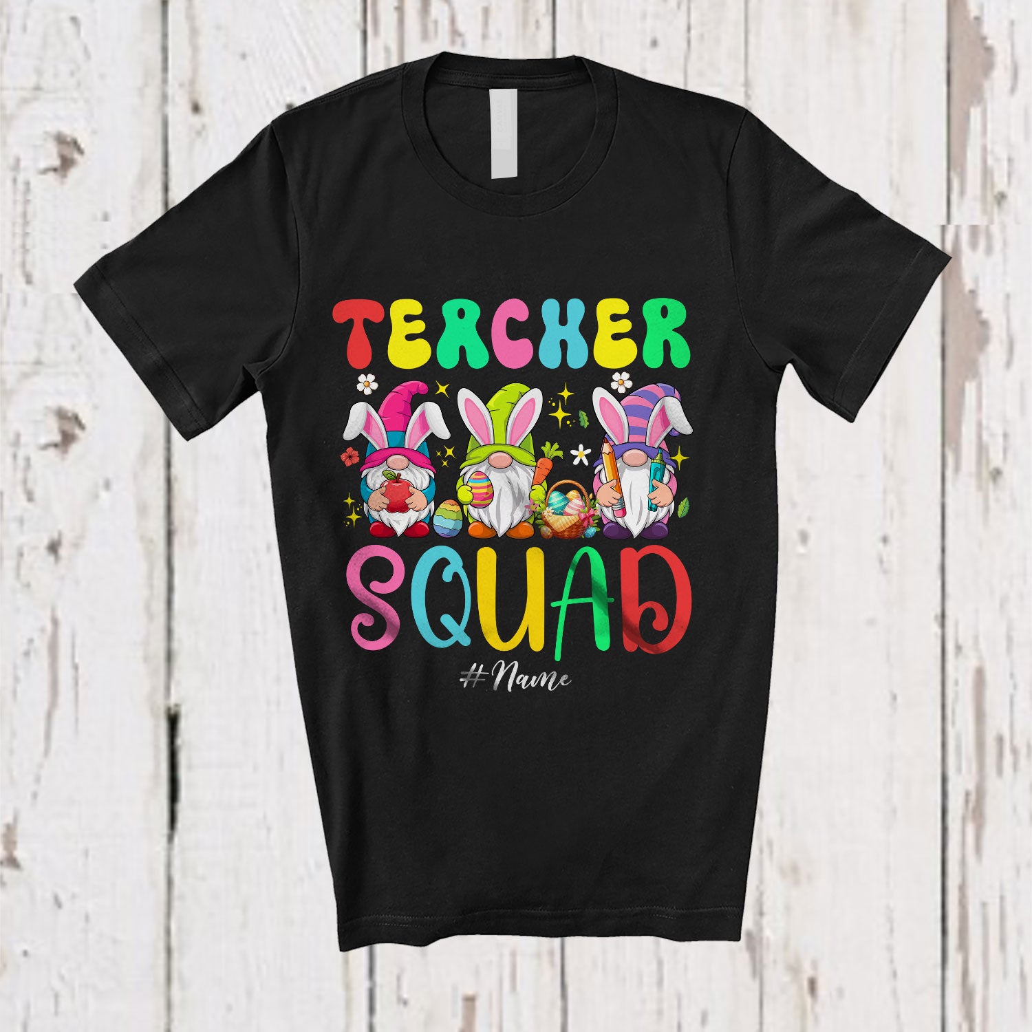 • Personalized Custom Name Teacher Squad; Awesome Easter Three Bunny Gnomes; Egg Hunting T-Shirt. This cotton t-shirt is a durable staple product with a classic fit. One of the most popular items, it has a relaxed style made for everyday and casual wear.